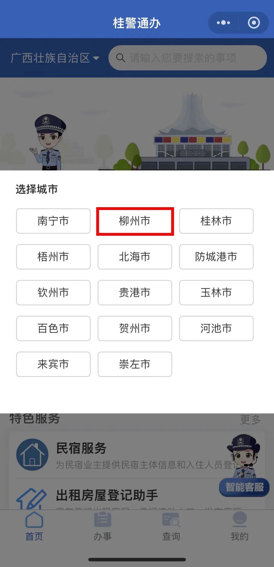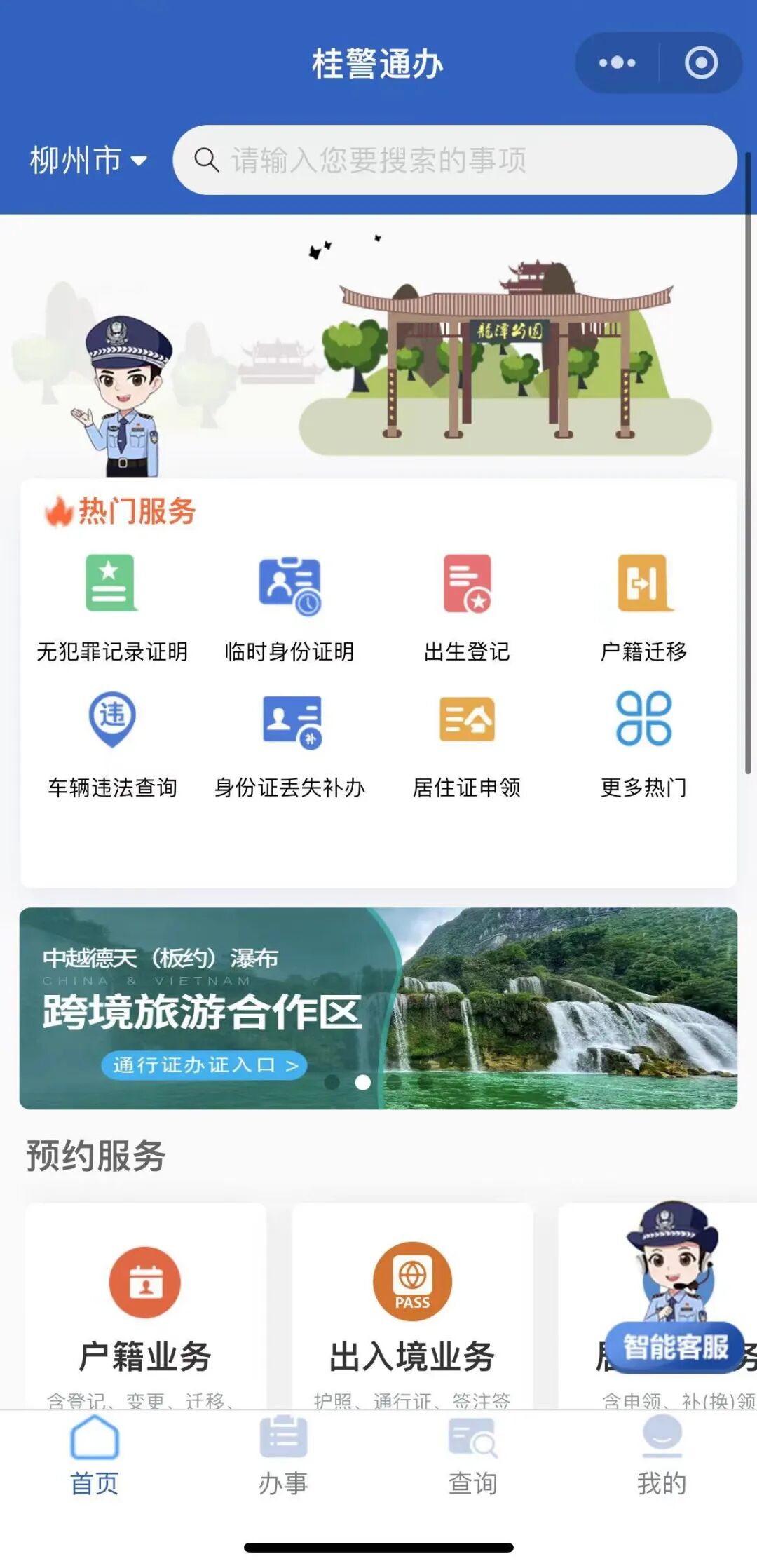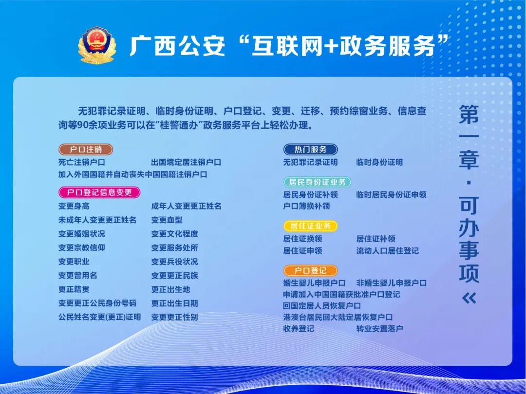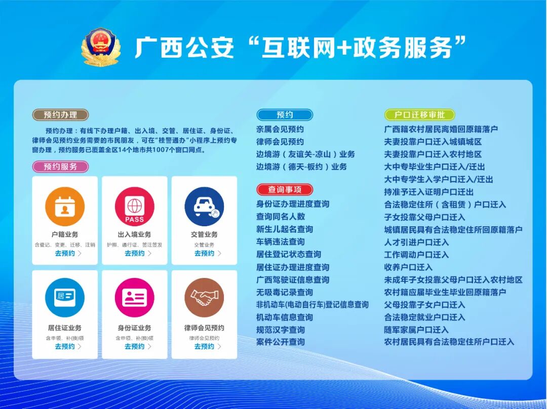 目前,“桂警通办“已上线治安、刑侦、出入境、交警、监管、法制等6个警种的服务事项共185项,对接公安部“互联网+政务服务”平台,广西壮族自治区级人口管理信息系统、各市支付平台等24个业务系统,实现公安政务服务事项集中办理、网上支付。平台开发有微信、支付宝“桂警通办”小程序,开通了无犯罪记录证明、婚生婴儿申报户口、居民身份证补领、律师会见预约、边境游网上办证、户籍业务网上预约(预受理)等多个高频便民服务事项。