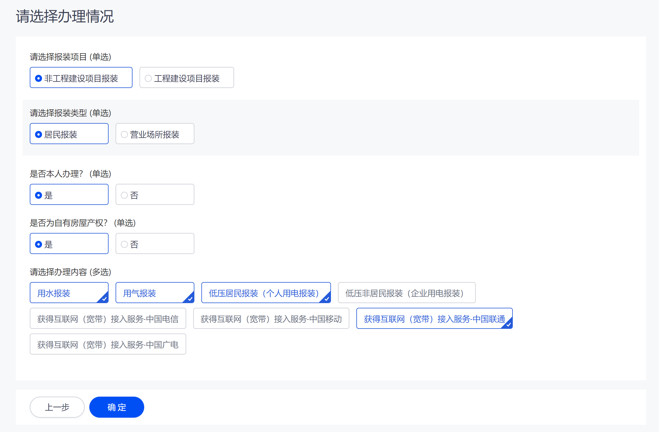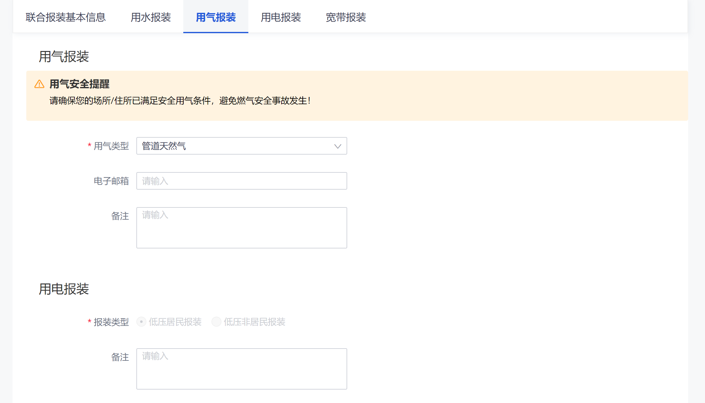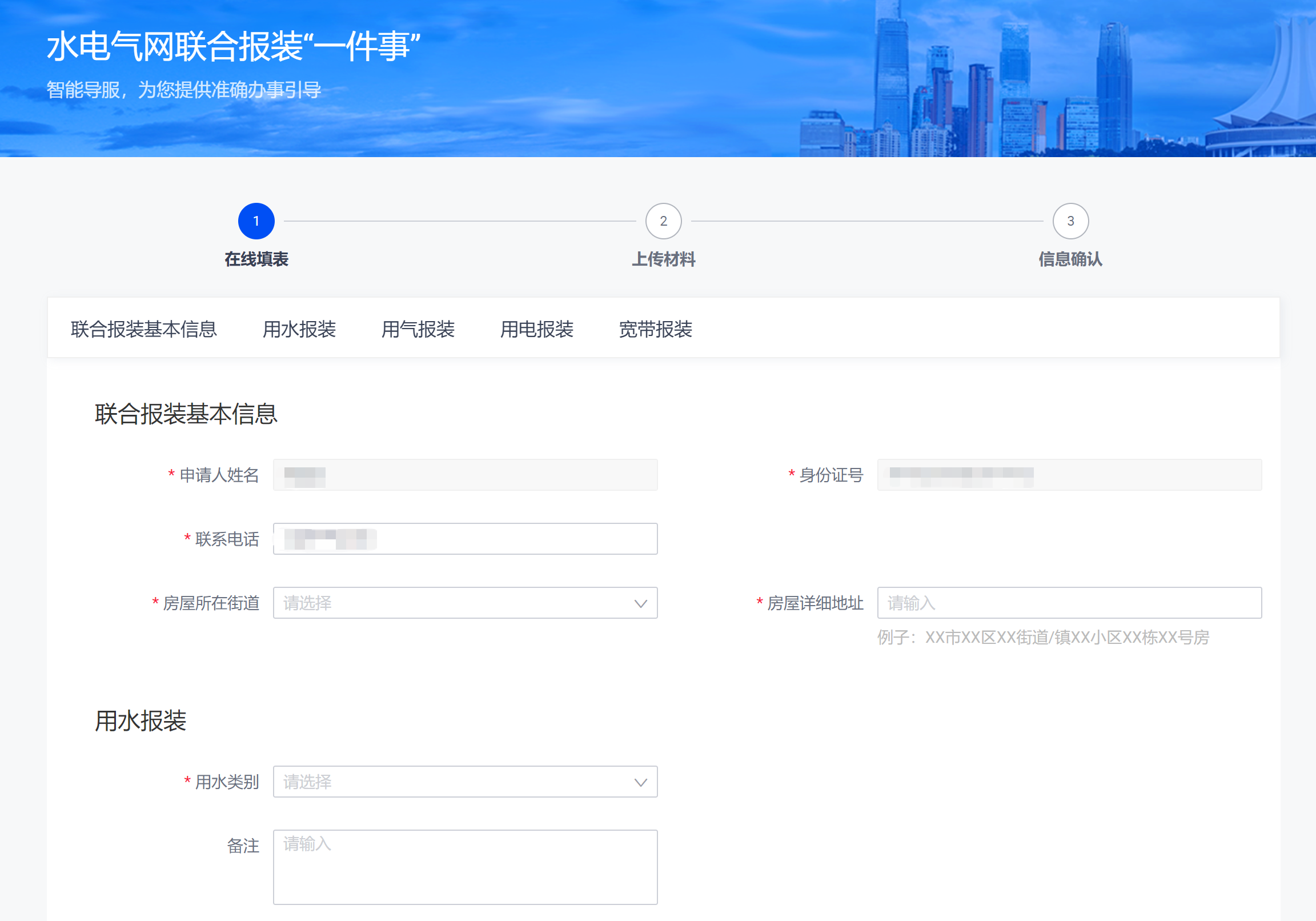 进入“在线填表”页面,按照实际情况填写联合报装基本信息、用水报装、用气报装、用电报装、宽带报装五部分内容(*星号为必填内容),并点击【下一步】进入上传材料界面;
