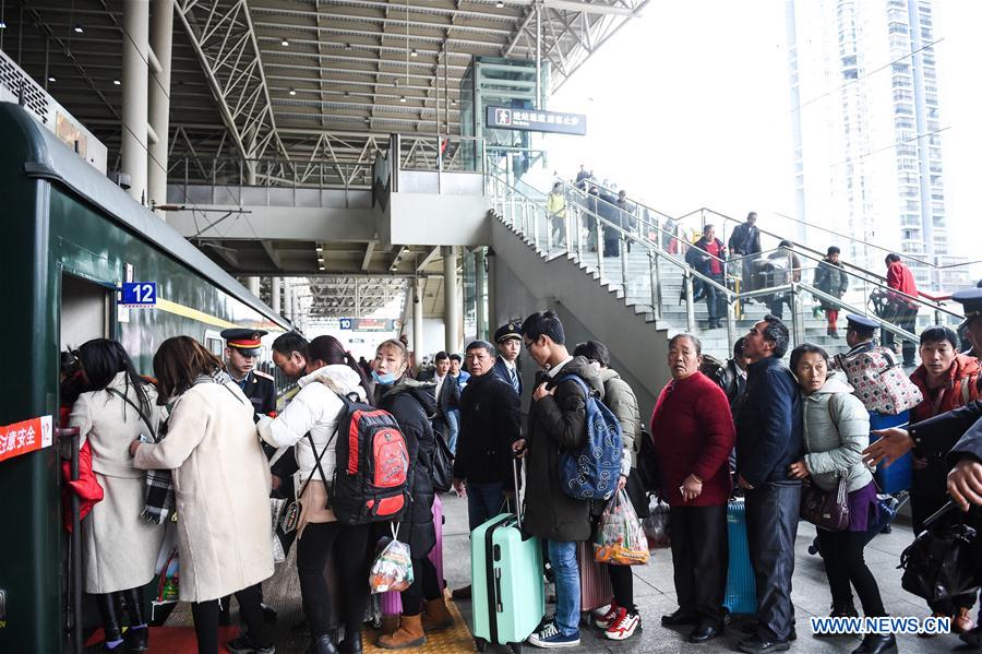 Passengers queue and board the train at Guiyang Railway Station in Guiyang, capital of southwest China's Guizhou Province, Feb. 21, 2018. Passenger numbers are expected to grow on Wednesday, the last day of week-long Chinese Lunar New Year holiday. (Xinhua/Tao Liang)