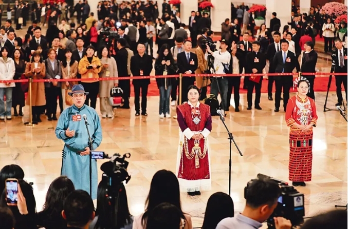 2025年3月10日,全国政协十四届三次会议第三场“委员通道”在人民大会堂举行。图为少数民族委员亮相“委员通道”。 民族画报记者 康梦婷/摄