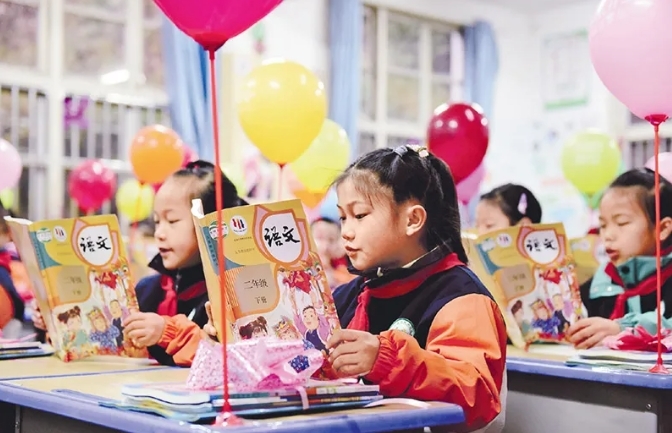 近年来,各地加快推广普及国家通用语言文字,全面推行使用国家统编教材。图为2025年2月17日,在贵州省黔东南苗族侗族自治州从江县城关第三小学,学生们正在阅读刚领到的新课本。 视觉中国 石宏辉/摄