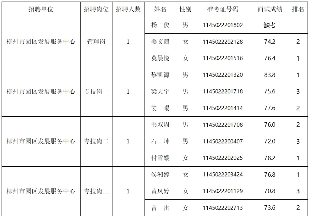 根据《柳州市2025年度上半年事业单位公开考试招聘工作人员公告》要求及安排,柳州市产业园区改革发展办公室下属事业单位公开招聘工作人员面试工作已结束, 公招面试考生成绩如下: