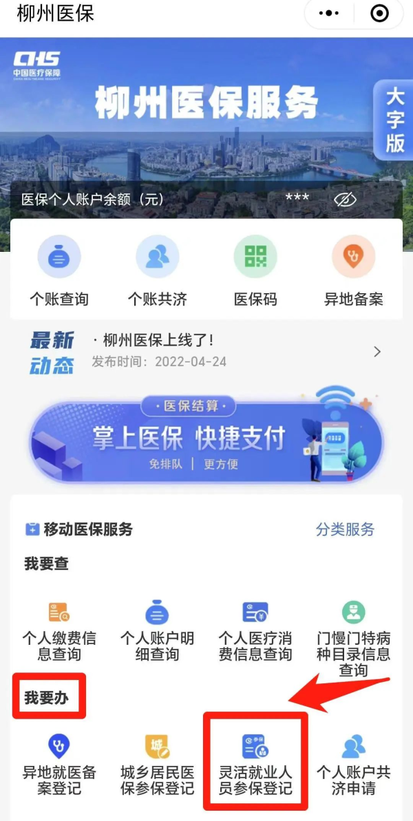 关注“柳州医保”微信公众号→“医保服务”→“掌上办事”→“我要办”→“灵活就业人员参保登记”。