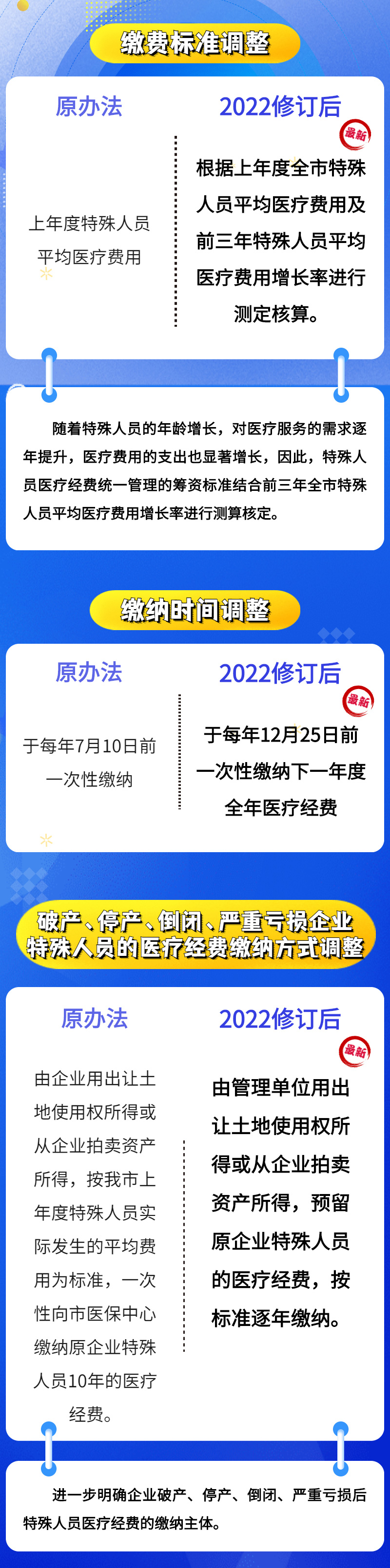 2.破产、停产、倒闭、严重亏损企业特殊人员的医疗经费,由“由企业用出让土地使用权所得或从企业拍卖资产所得,按我市上年度特殊人员实际发生的平均费用为标准,一次性向市医保中心缴纳原企业特殊人员10年的医疗经费。”改为“由管理单位用出让土地使用权所得或从企业拍卖资产所得,预留原企业特殊人员的医疗经费,按标准逐年缴纳。”进一步明确企业破产、停产、倒闭、严重亏损后特殊人员医疗经费的缴纳主体。