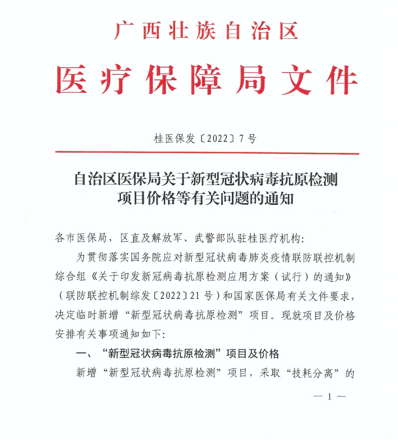 现将《自治区医保局关于新型冠状病毒抗原检测项目价格等有关问题的通知》(桂医保发〔2022〕7号)转发给你们,请遵照执行。