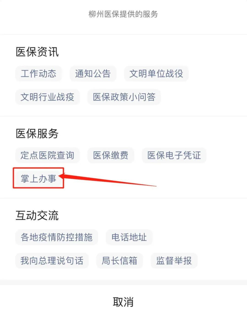 关注“柳州医保”微信公众号,进入医保服务菜单,点击【掌上办事】,选择你所需的医保业务进行查询、办理即可。