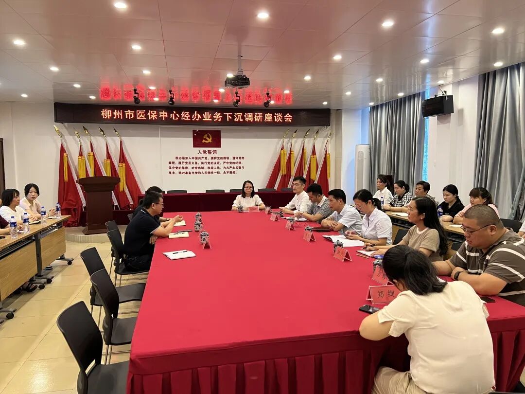 图为柳州市医疗保障事业管理中心主任蓝志成一行到五里亭街道进行实地调研并座谈。鱼峰区医疗保障局局长魏鹏、五里亭街道党工委书记郭克光等陪同调研。