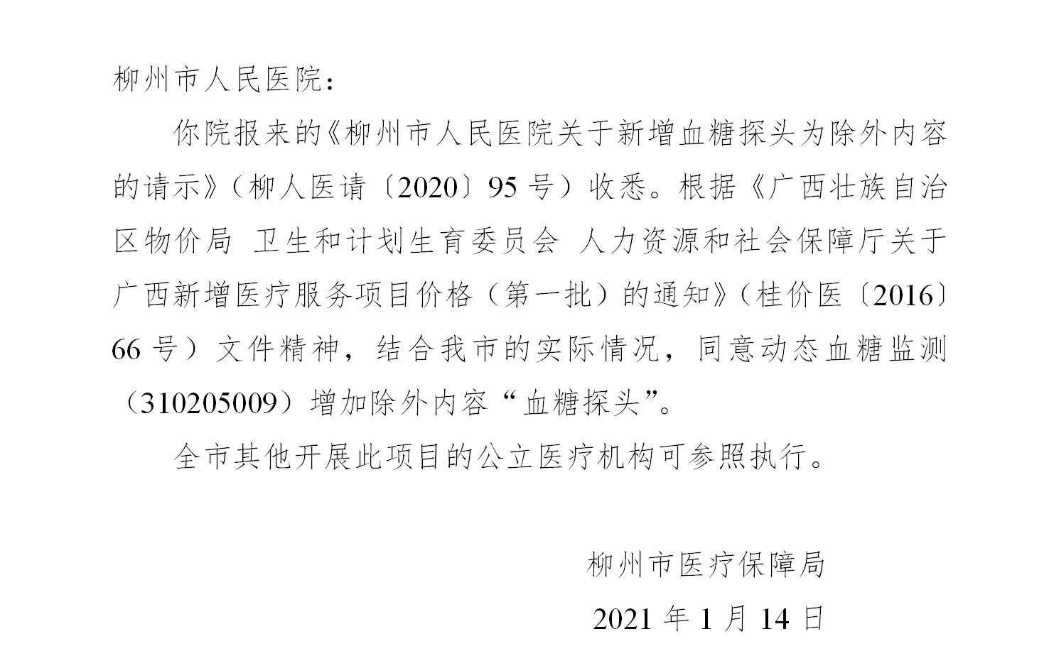 关于《柳州市人民医院关于新增血糖探头为除外内容的请示》的批复 (柳医保复〔2021〕1号 )