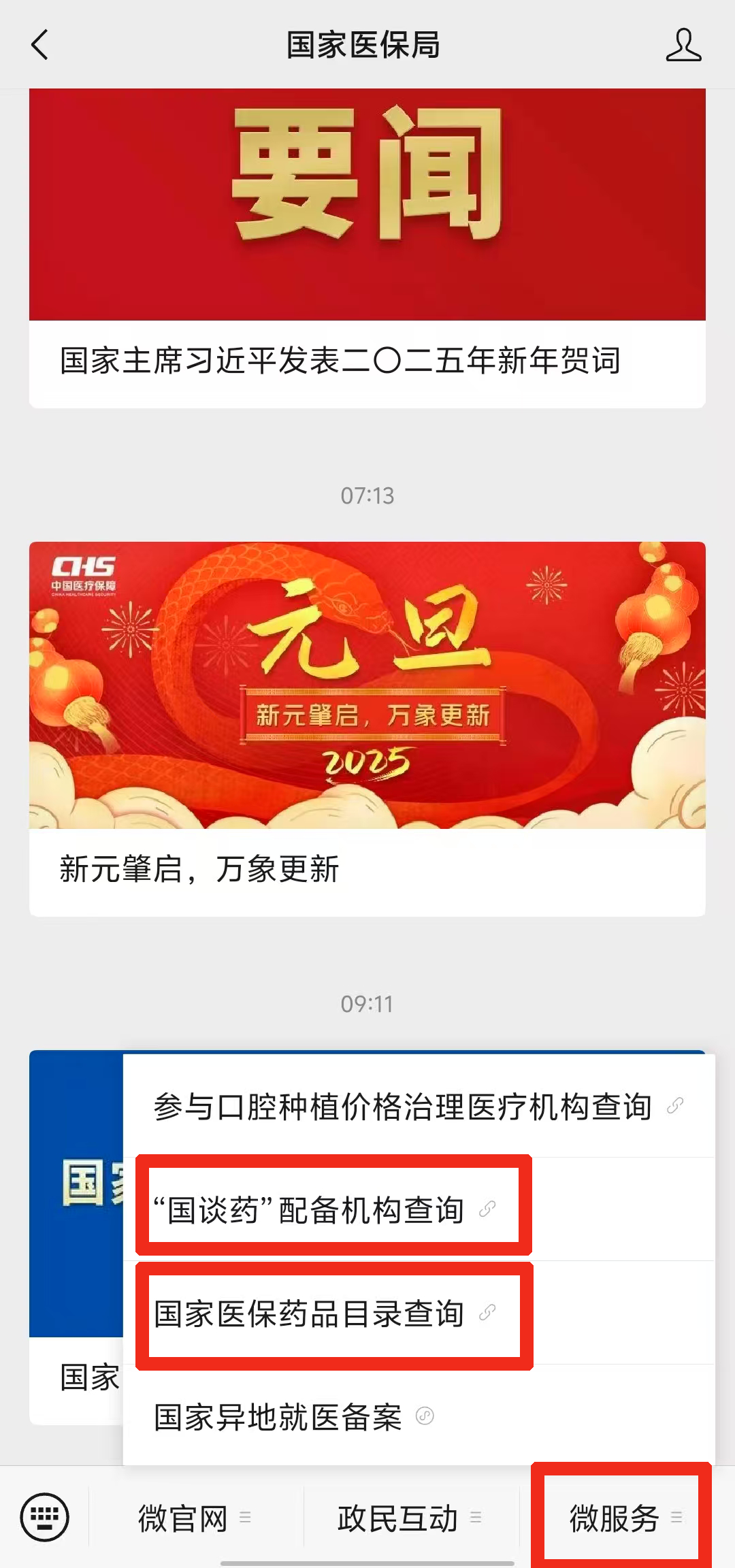 新版医保药品目录于2025年1月1日正式施行,参保群众可通过点击国家医保局微信公众号“微服务”—“国家医保药品目录查询”和“‘国谈药’配备机构查询”,实时查询医保药品目录及协议期内谈判药品配备机构名单。