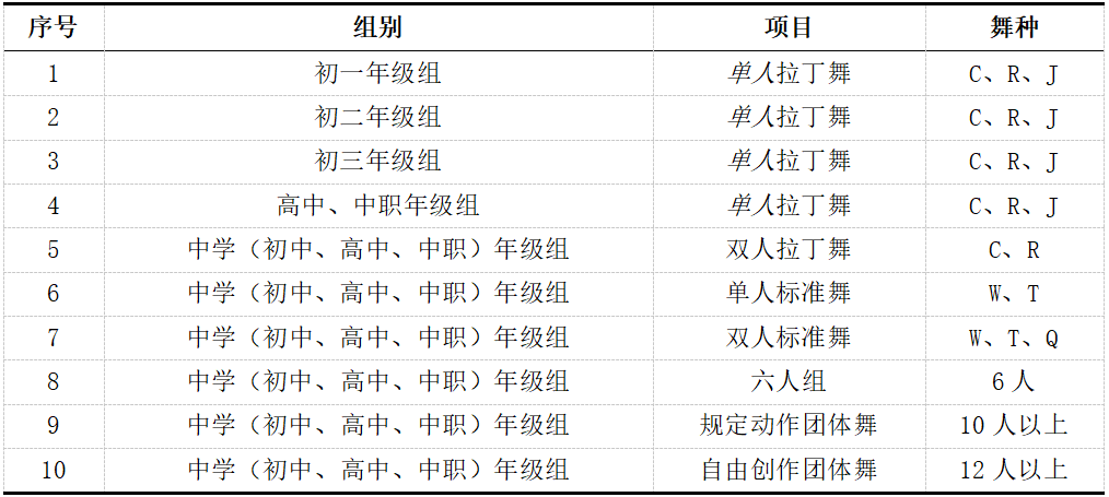 ![]() 赛资格二年,并全市通报。(七)比赛裁判由组委会选派。十三、本规程的解释权归赛事组委会。未尽事宜,另行通知。附件-组别设项初中、高中、中职组别设项小学组别设项注:S:桑巴、C:恰恰恰、R:伦巴、J:牛仔、W:华尔... |