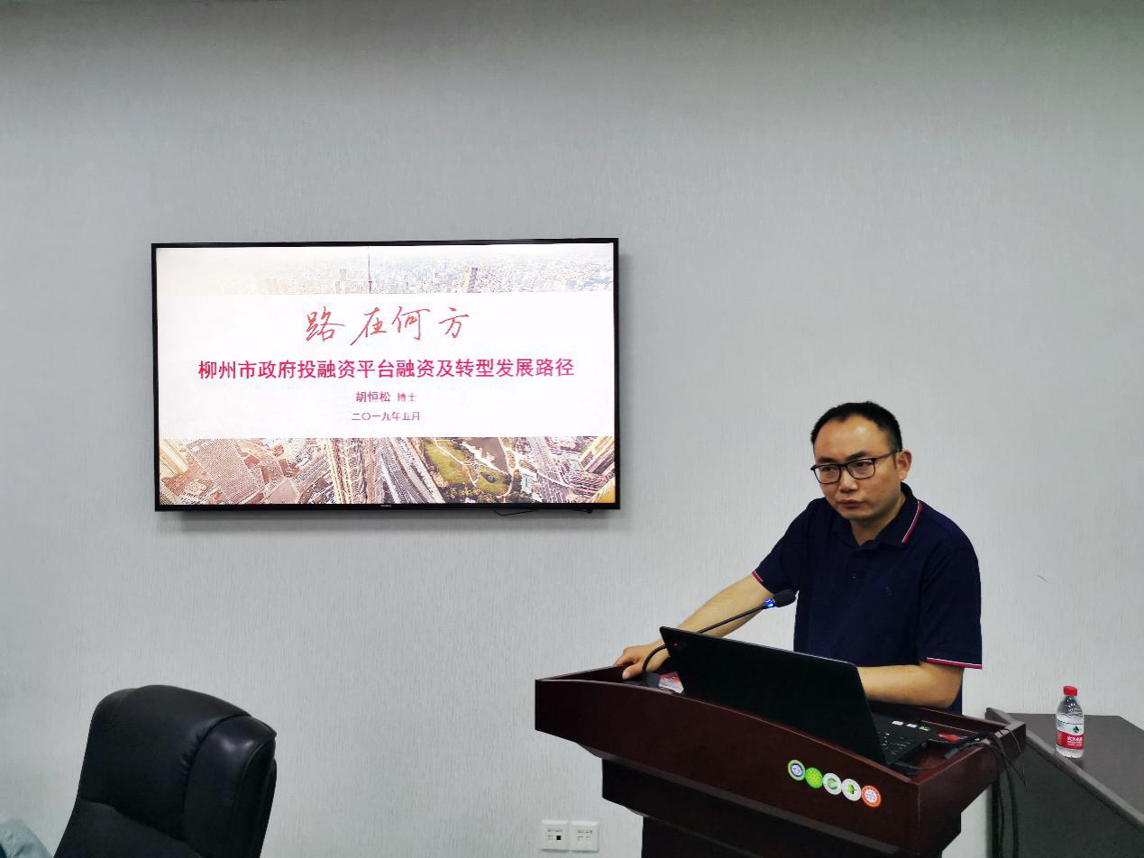 会议第二阶段为当前投融资形势探讨,中国人民大学经济学院博士、财达证券股份有限公司总经理助理胡恒松博士作了题为《关于柳州市政府投融资平台融资及转型发展路径》专题讲座,胡恒松博士先对中国宏观环境、广西和柳州的经济环境进行了介绍和分析,后对政府平台融资途径进行了分类介绍,之后对政府融资平台转型和债务化解途径进行了分析,最后在对各类柳州平台类公司的业务模式、财务及发债情况的基础上为柳州的投融资转型提出了建议。之后各单位对当前融资形势进行了探讨。