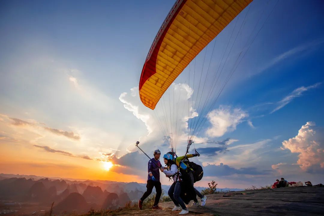 游客在百乐竹海公园飞行营地体验滑翔伞