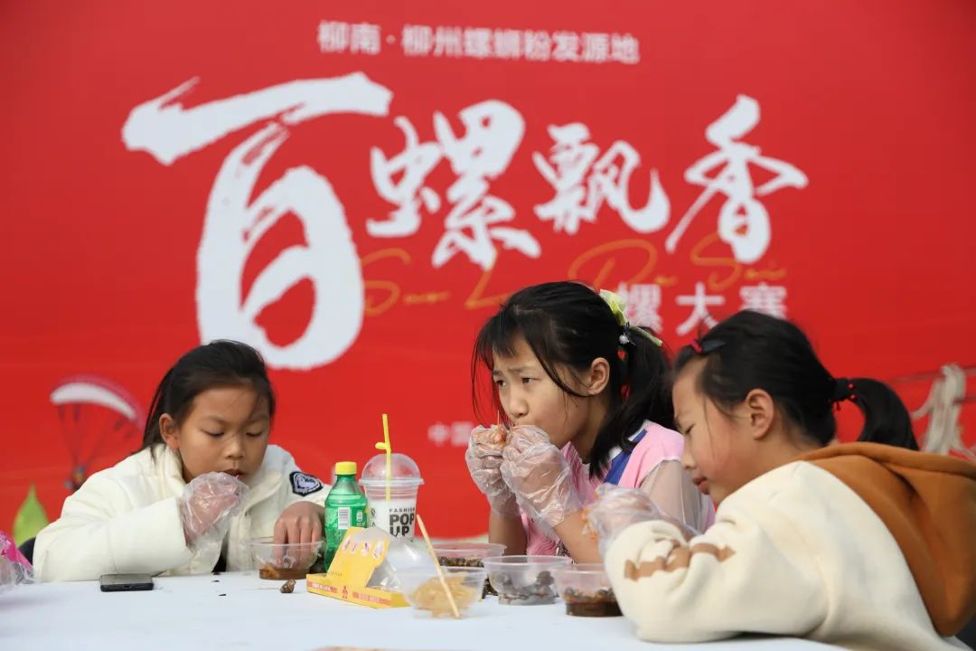 游客参加螺蛳粉小镇文化节嗍螺大赛