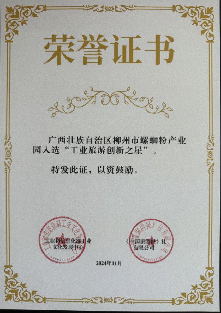 ▲柳州螺蛳粉产业园“工业旅游创新之星”荣誉证书