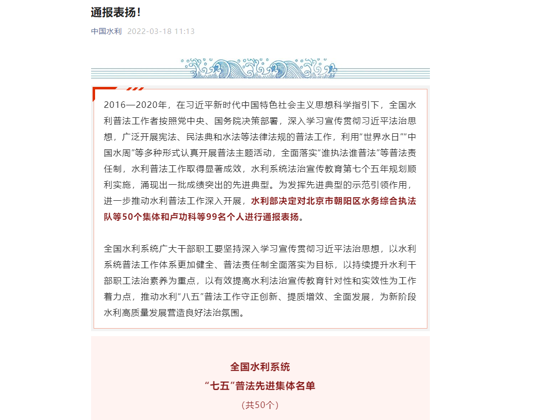 凝聚法治力量 助推高质量水利发展 柳州市水利局喜获全国“七五”普法先进集体荣誉称号
