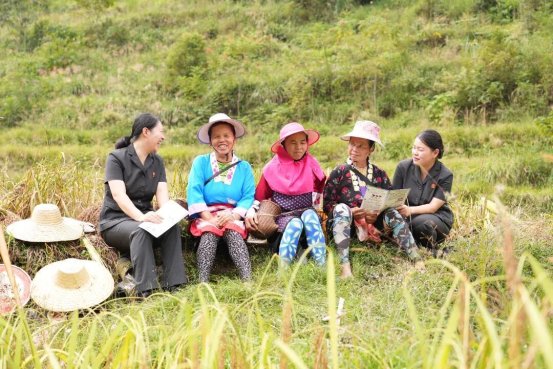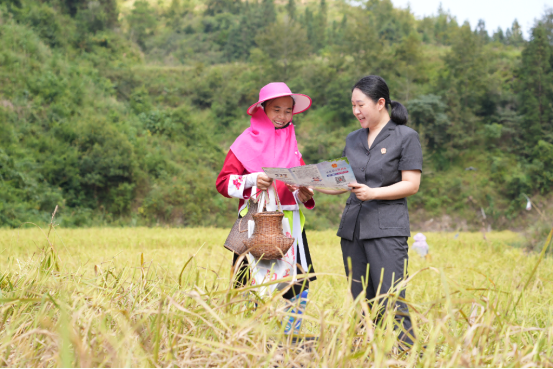 岑牙村作为苗族聚居村寨,稻田是村民最主要的生产资料和生活依托。与传统法庭的庄严肃穆不同,这场法治课没有审判席与旁听席的界限,干警们或蹲或站,与村民围坐在田埂边,身旁就是沉甸甸的稻穗,浓郁的乡土气息让法律知识变得可感可知。