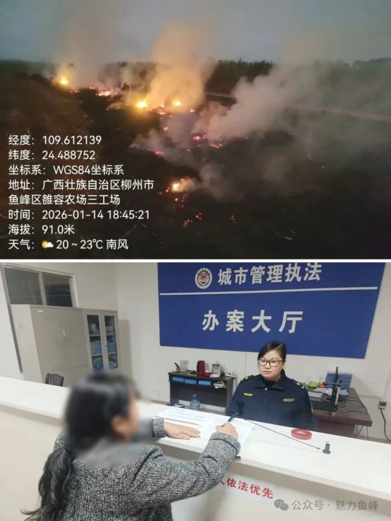 鱼峰区综合行政执法局持续强化立体化巡查与部门联动,科技协查高效推进执法工作。2026年1月14日18时许,雒容农场区域出现露天焚烧秸秆(甘蔗叶)火点,现场火光冲天、浓烟滚滚。执法人员接到线索后高度重视,当即立案调查,并联合公安部门通过“天眼”系统迅速锁定违法当事人。次日,执法人员在派出所民警配合下,找到了露天焚烧当事人,其解释称承包该地块用于种植甘蔗,焚烧甘蔗叶是为了堆积肥料,并表示“看到没有明火我才走的”。经过执法人员的普法教育,当事人承认了其违法事实,深刻认识到自己的错误。其行为违反了《中华人民共和国大气污染防治法》第七十七条规定,依据相关规定执法人员作出责令立即改正并处罚款2000元的行政处罚。