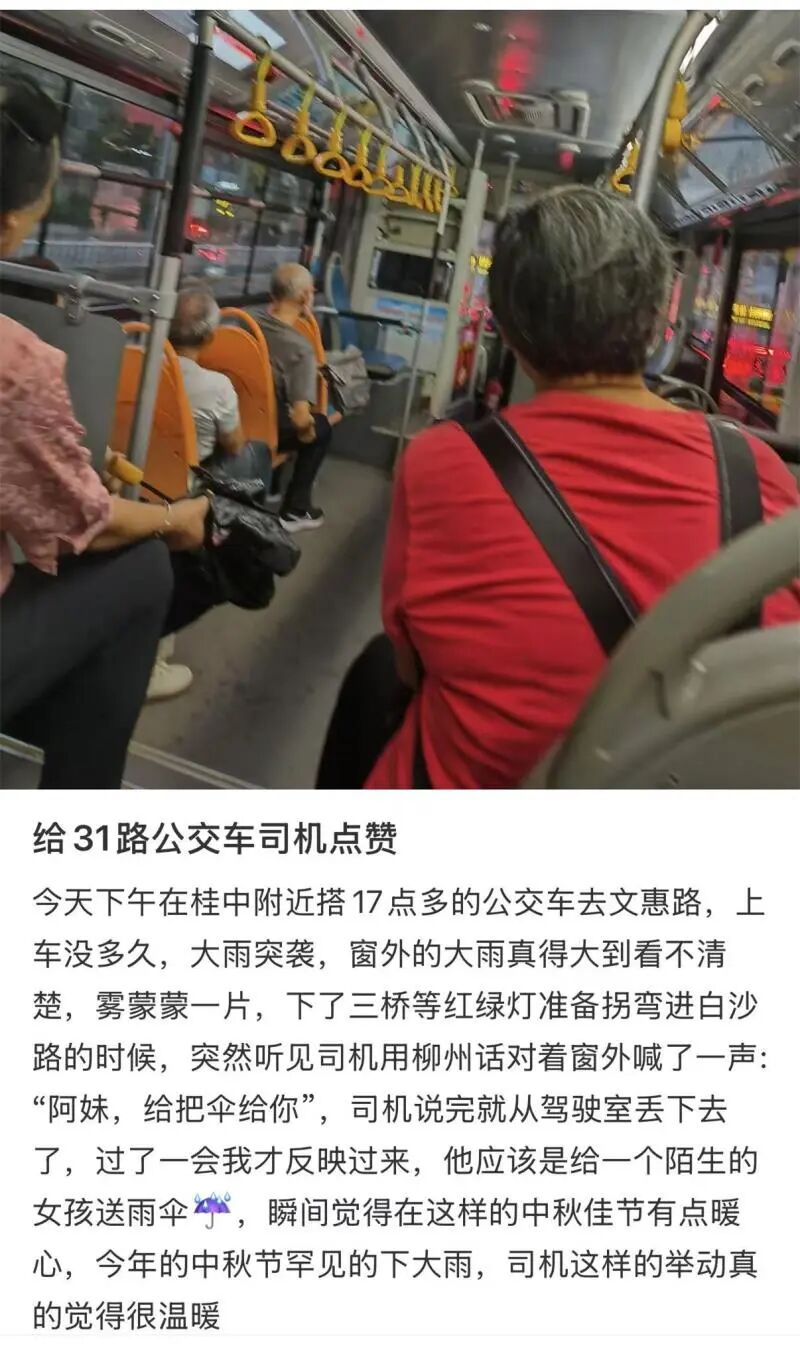 近日,有市民在网上发布“给31路公交车司机点赞”的帖子引发热议。该网友称,中秋节当天,公交车司机在大雨中给一位陌生女孩送雨伞,暖心之举感人。