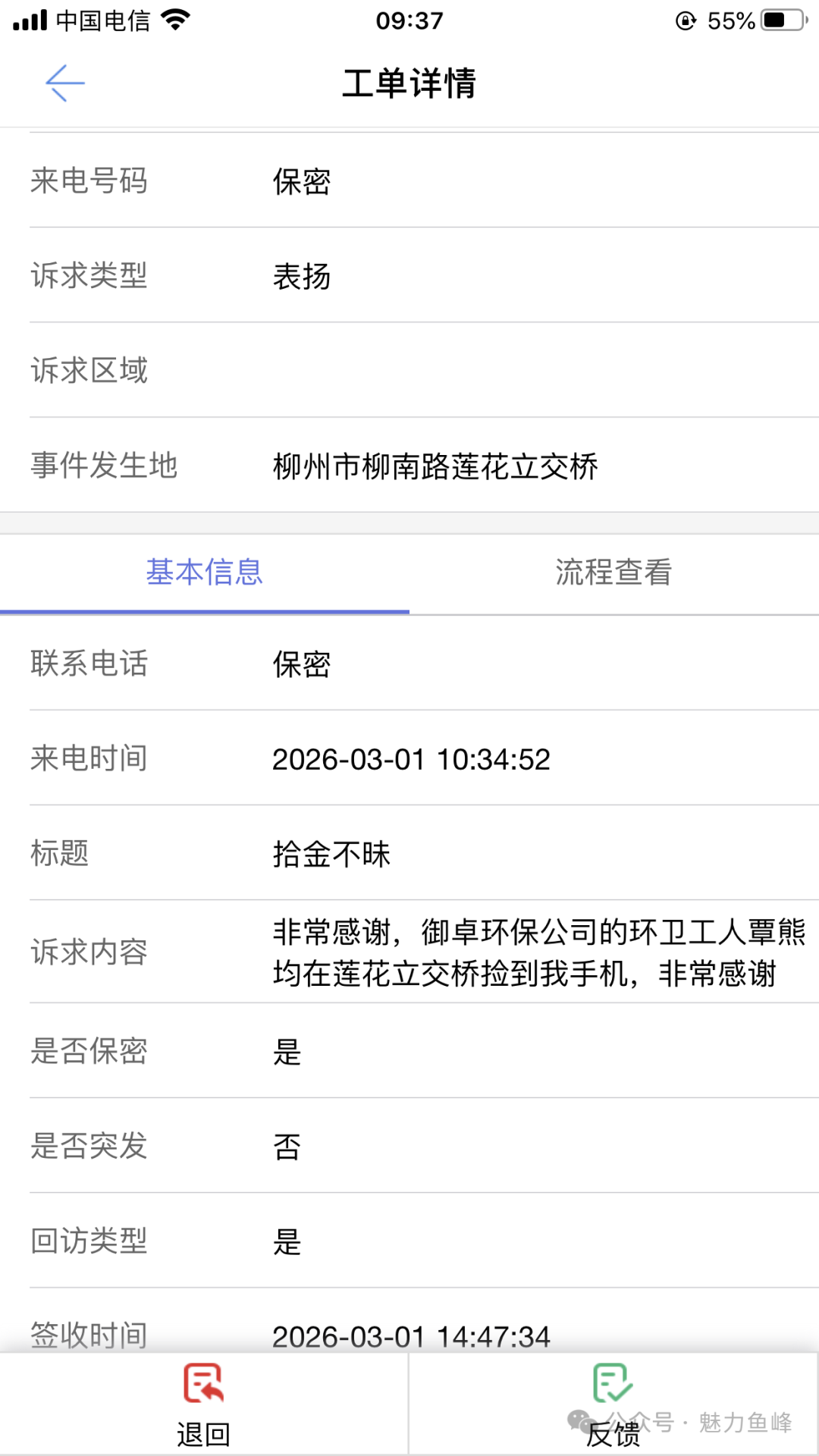 3月1日,环卫工人覃熊均在莲花立交路段日常清扫时,捡到一部因电量耗尽而关机的手机。面对贵重物品,他不为所动,第一时间上交单位。环卫所工作人员立即为手机充电、细心等候失主来电,在核实信息后,通过闪送将手机安全送还。失主失而复得,特意致电政府热线,为环卫工人的诚信与热心点赞。