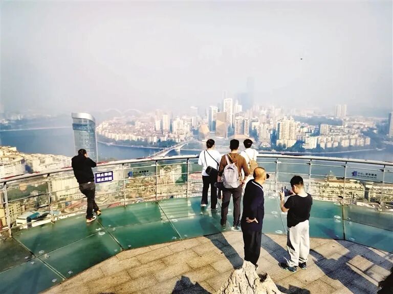 市民和游客在马鞍山玻璃观景台上欣赏柳州美景。