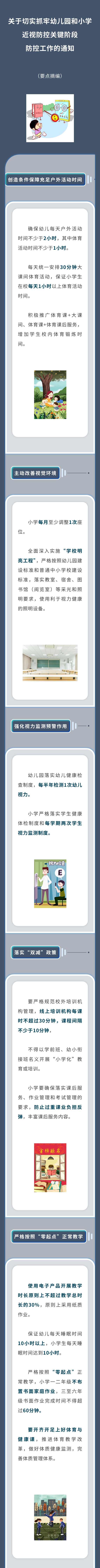 一、创造条件保障充足户外活动时间。要鼓励幼儿园老师和家长带领孩子参加以游戏为主的户外活动和适宜的体育运动,确保幼儿每天户外活动时间不少于2小时,其中体育活动时间不少于1小时。要严管教师拖堂或占用课间休息时间,有序组织和督促小学生课间到室外活动或远眺,防止学生持续疲劳用眼。鼓励在教室门口或公共区域设置形式多样、丰富有趣的“微活动区”。每天统一安排30分钟大课间体育活动,保证小学生在校每天1小时以上体育活动时间。积极推广体育课+大课间、体育课+体育课后服务,增加学生校内体育锻炼时间。