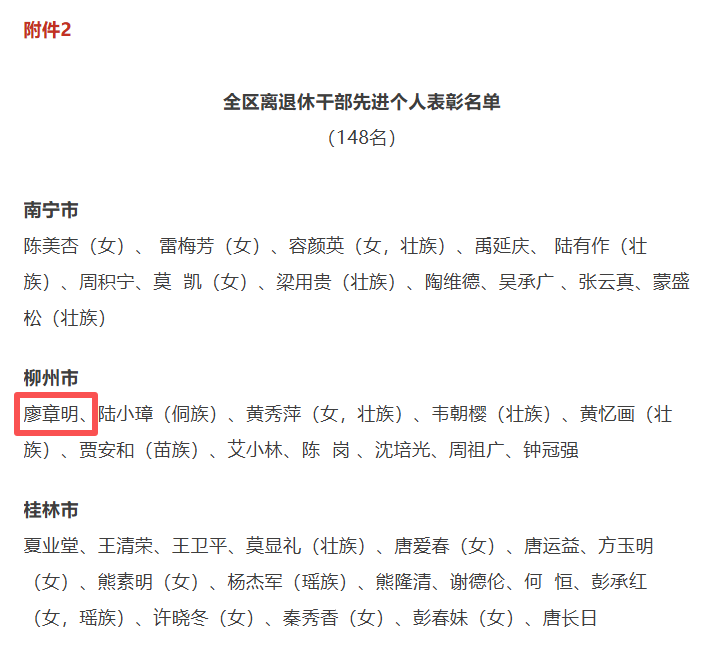 柳州市军休干部廖章明获全区离退休干部先进个人表彰。
