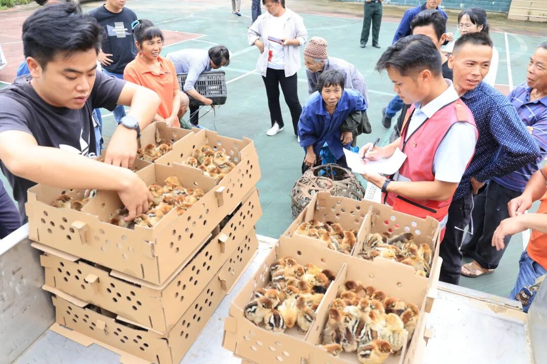 活动现场,柳州市立华牧业有限公司工作人员一边给村民发放免费的鸡苗,一边对他们进行详细的养殖技术指导,叮嘱他们要保持水源清洁、定期打扫卫生、合理投喂食物等事项,确保鸡苗的生长发育,为增收提供有效保障。