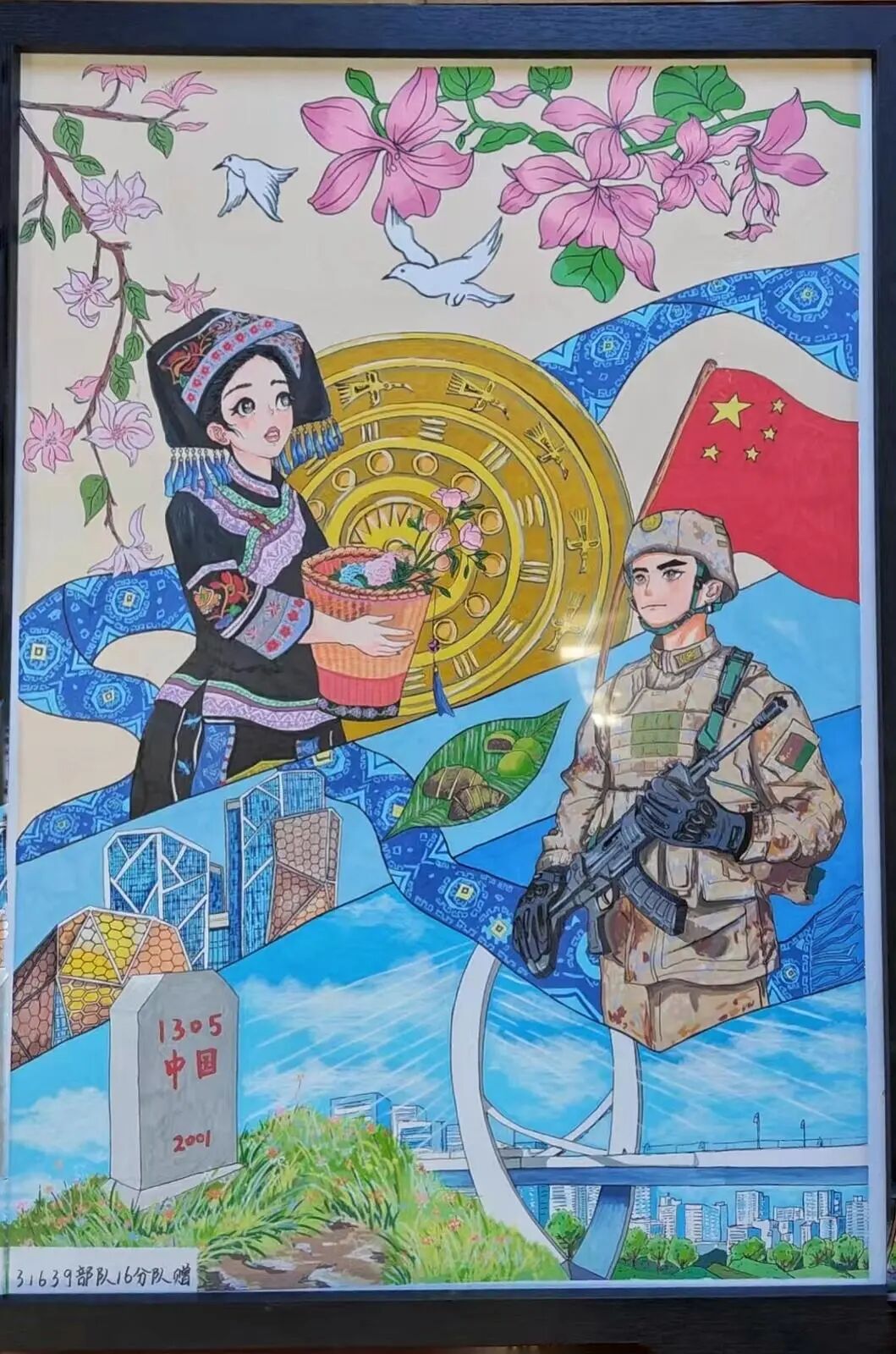 31639部队16分队的官兵通过手绘画、手写春联向柳州人民拜年。绘画作品上不仅有紫荆花、白沙大桥、风情港等柳州元素,还有界碑、战士形象等内容,展示了军民双向奔赴的场景。