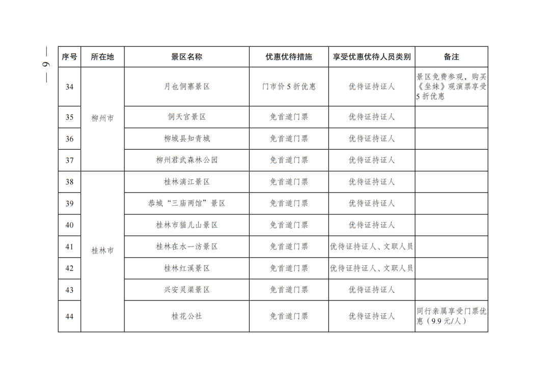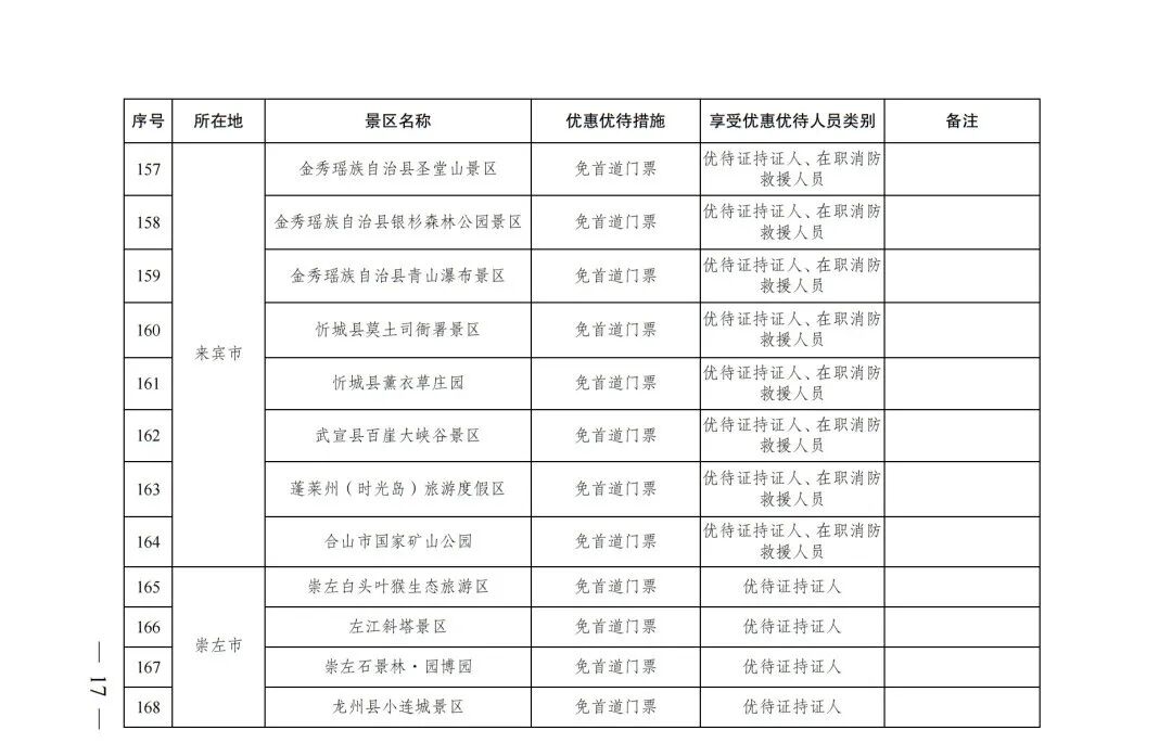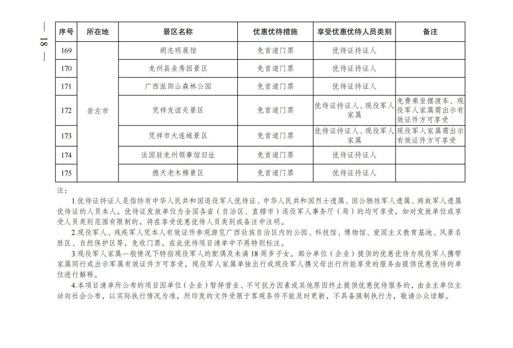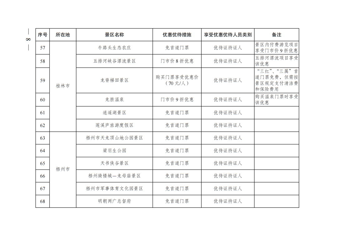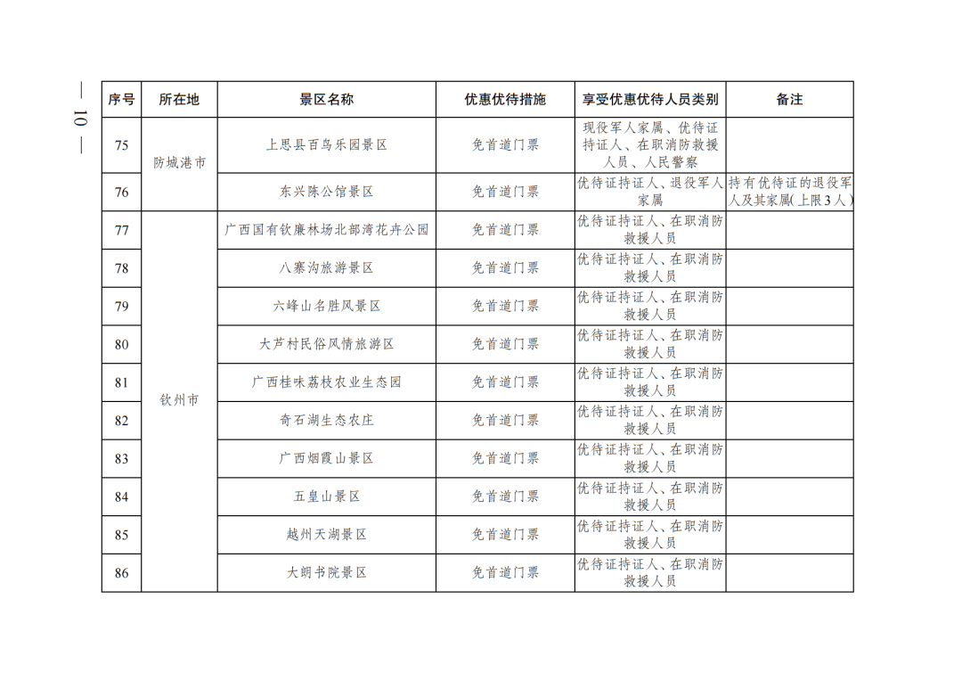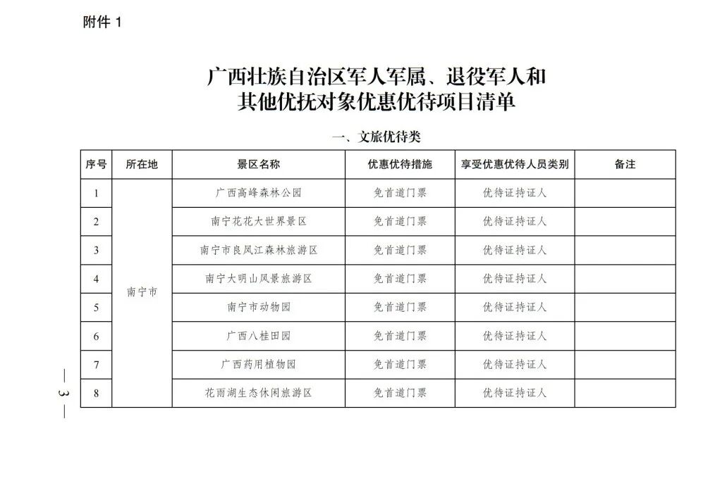 近日,广西壮族自治区退役军人事务厅印发通知,汇总了广西各地优惠优待目录清单,现向社会公布。此外,现役军人、残疾军人凭本人有效证件参观游览广西壮族自治区内的公园、科技馆、博物馆、爱国主义教育基地、风景名胜区、自然保护区等,免收门票,在此优惠优待项目清单中不再特别标注。