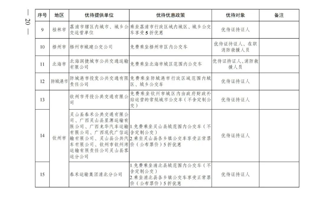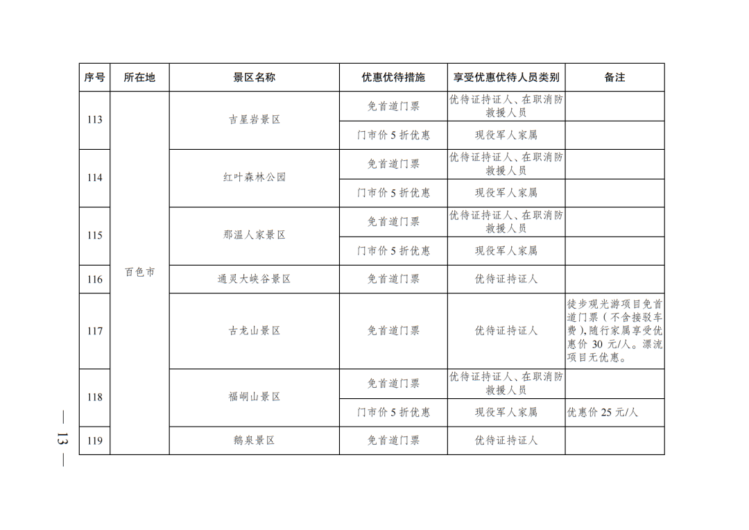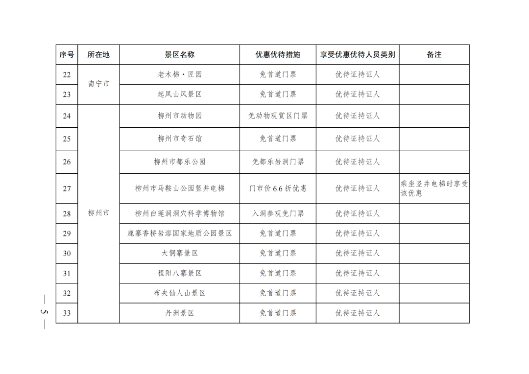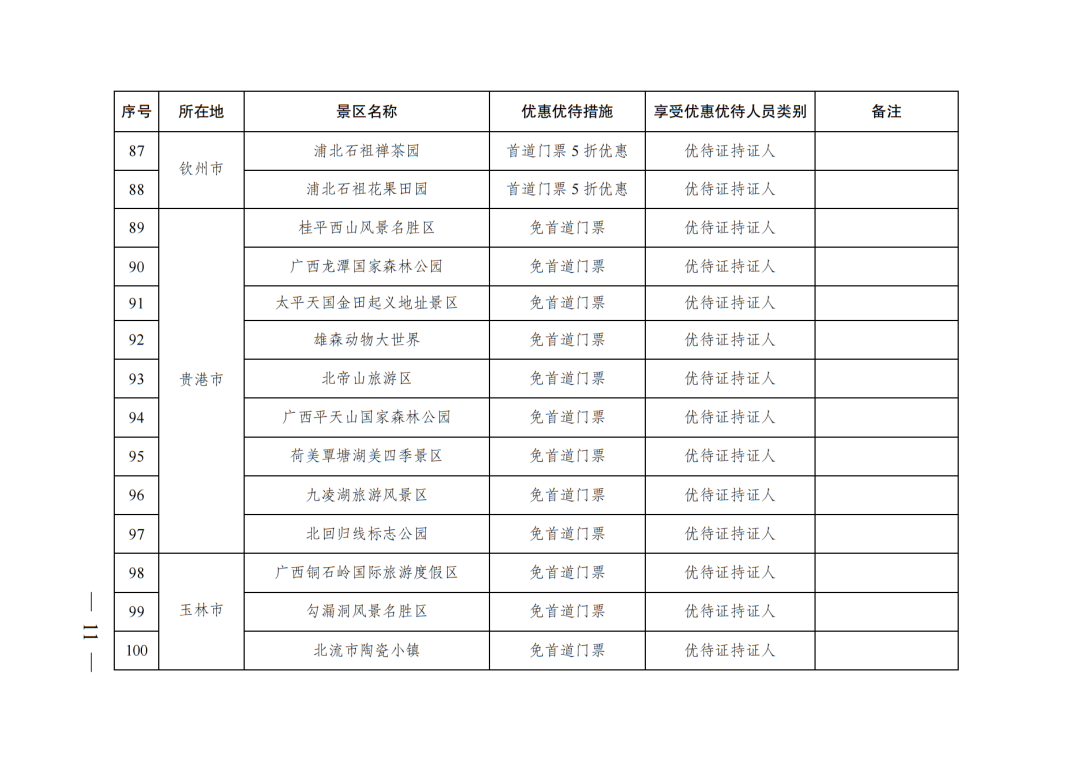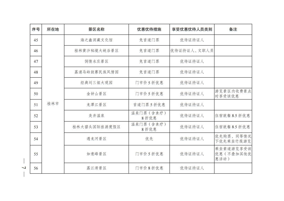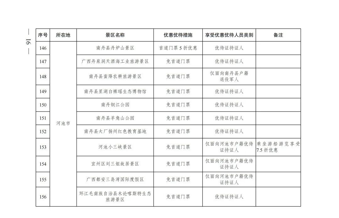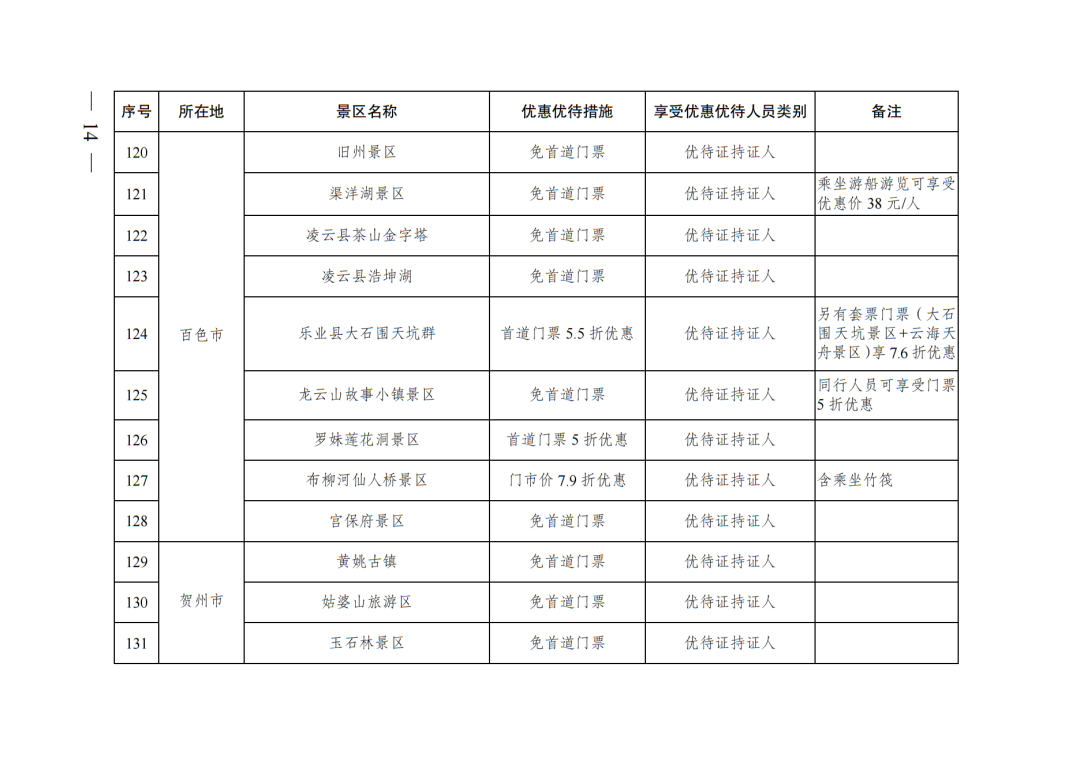 近日,广西壮族自治区退役军人事务厅印发通知,汇总了广西各地优惠优待目录清单,现向社会公布。此外,现役军人、残疾军人凭本人有效证件参观游览广西壮族自治区内的公园、科技馆、博物馆、爱国主义教育基地、风景名胜区、自然保护区等,免收门票,在此优惠优待项目清单中不再特别标注。
