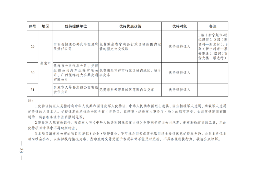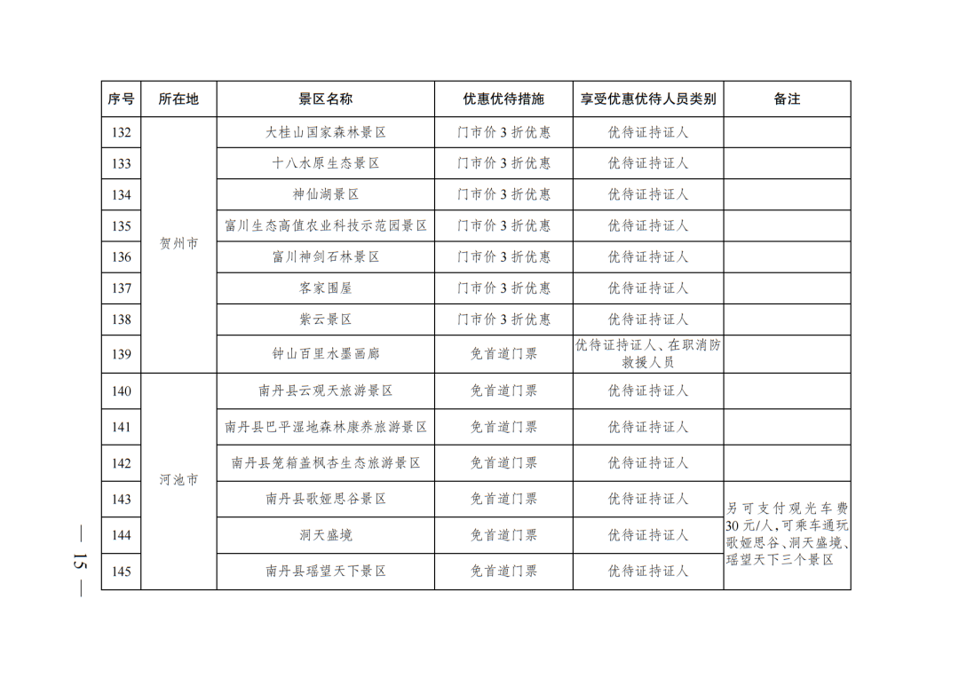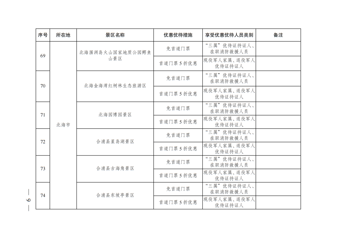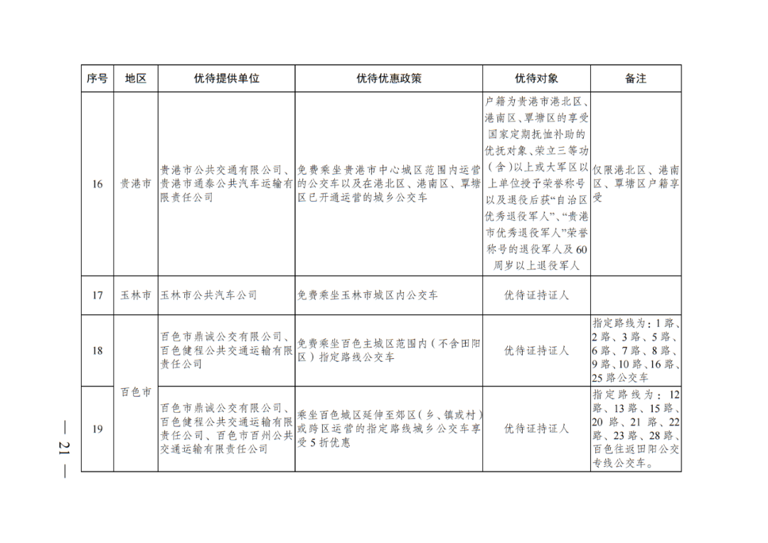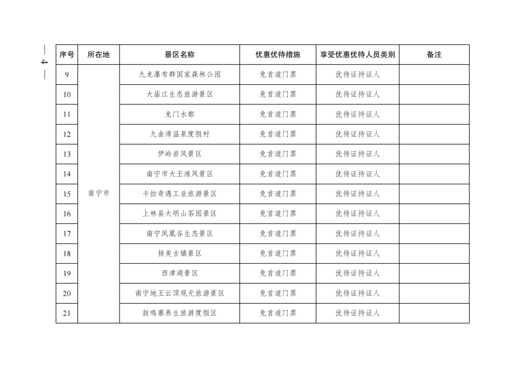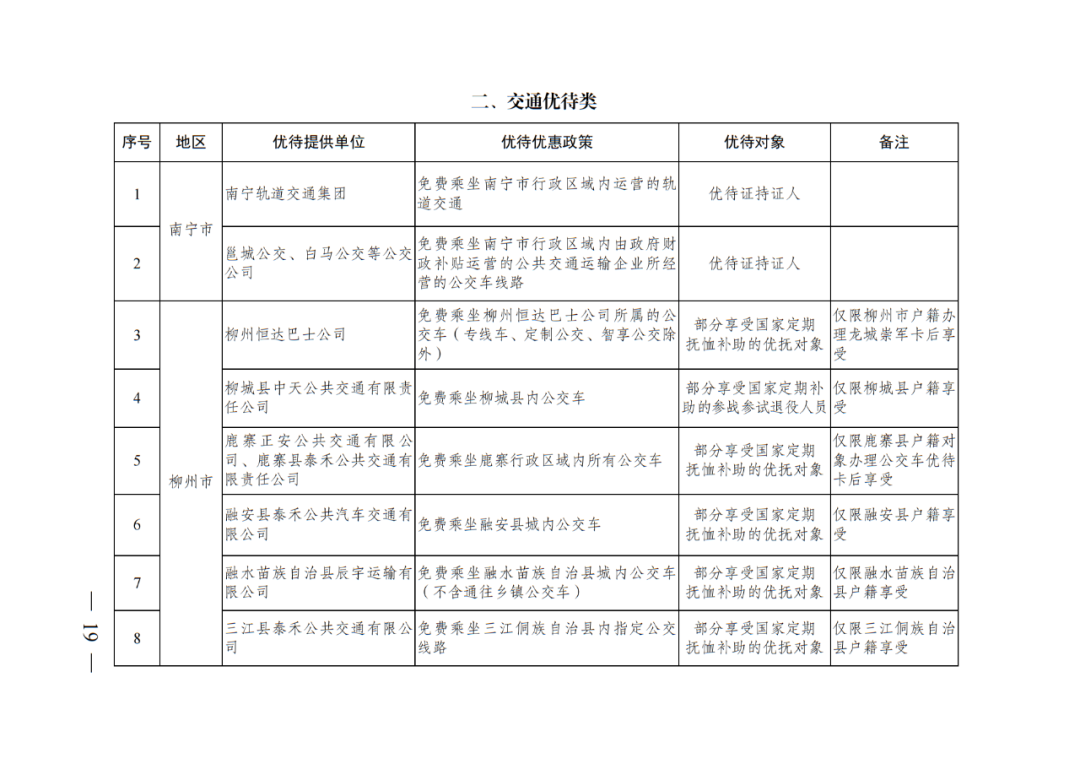 近日,广西壮族自治区退役军人事务厅印发通知,汇总了广西各地优惠优待目录清单,现向社会公布。此外,现役军人、残疾军人凭本人有效证件参观游览广西壮族自治区内的公园、科技馆、博物馆、爱国主义教育基地、风景名胜区、自然保护区等,免收门票,在此优惠优待项目清单中不再特别标注。