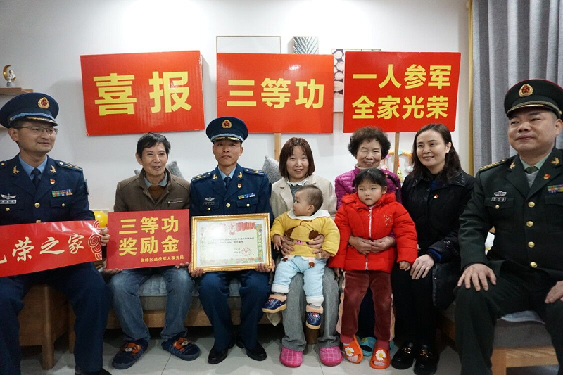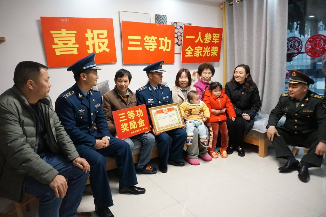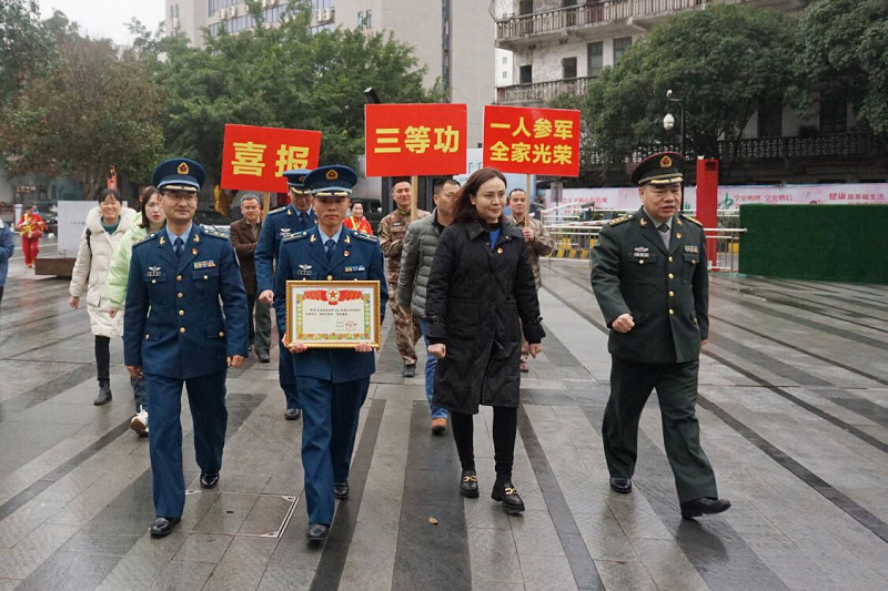 1月28日下午,柳州市鱼峰区乘龙社区荣和千千树小区内喜气洋洋、锣鼓齐鸣,现役军人谢紫龙一家迎来了一份特殊的“新年礼物”。鱼峰区委副书记韦菲菲、126旅政治部主任、鱼峰区武装部部长、鱼峰区退役军人事务局副局长杨松柏、荣军街道办事处主任黄丹、乘龙社区党委书记等领导、迎着细雨将现役军人谢紫龙的“三等功喜报”及新春慰问品送到其家中,向“光荣之家”送上了最崇高的敬意及新春的祝福。