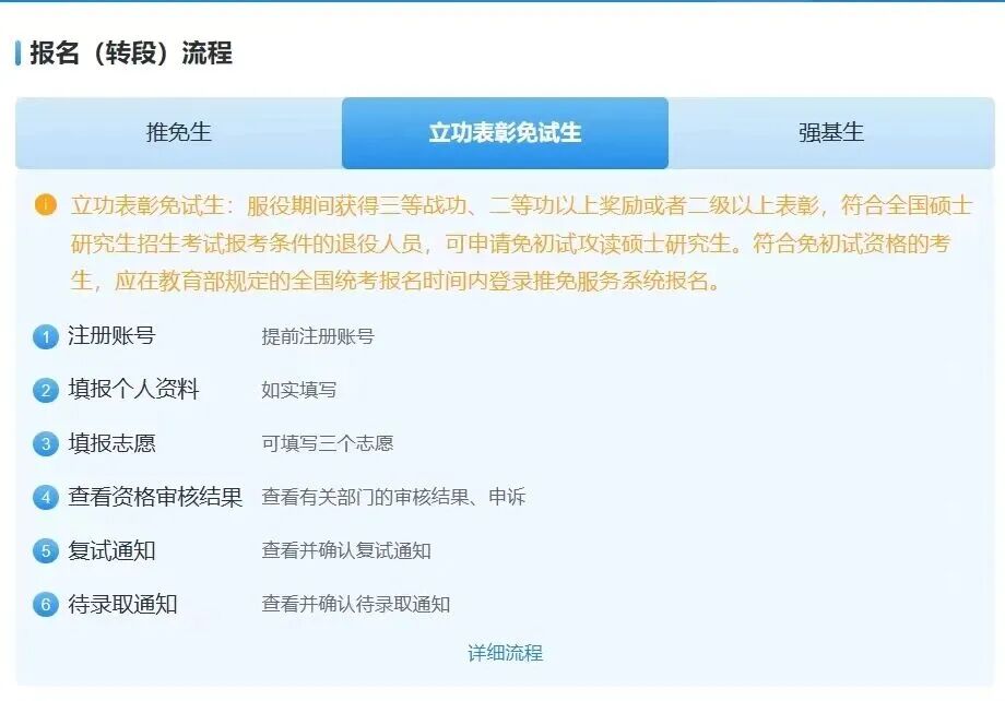 符合免初试资格的考生,应在教育部规定的全国统考报名时间内登录“全国推荐免试攻读研究生(免初试、转段)信息公开暨管理服务系统”(网址:https://yz.chsi.com.cn/tm)报名,逾期不得补报。