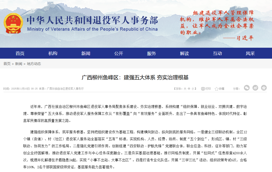 近年来,广西壮族自治区柳州市鱼峰区退役军人事务局聚焦体系建设、夯实治理根基,系统构建“组织保障、就业创业、双拥共建、数字治理、尊崇荣誉”五大体系,推动退役军人服务保障工作从“有形覆盖”向“有效服务”全面跃升,走出了一条具有鱼峰特色、体现时代特征、彰显军民情深的高质量发展之路。