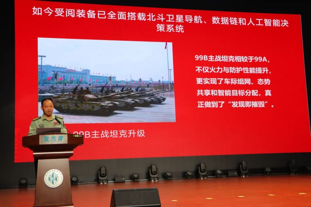 经历过2015年阅兵的军休干部何计灵首先登台,向学生们展示了2025年阅兵式上的新装备与新理念。他详细介绍了今年阅兵中亮相的一系列高科技装备,包括按作战模块编组的四代装备和具有精准毁伤、持续打击优势的舰载激光武器。“所有受阅武器装备都是国产现役主战装备,是继2019年国庆大阅兵后我军新一代武器装备的集中亮相。”何计灵引用阅兵领导小组办公室副主任的介绍说道。