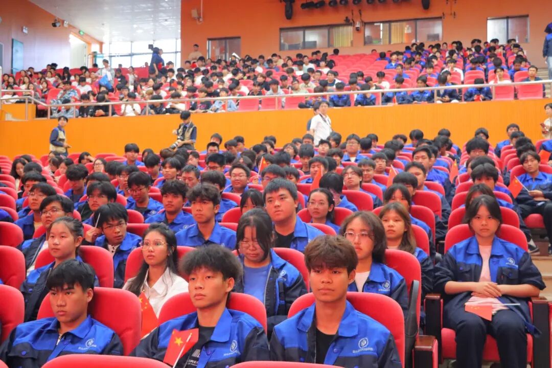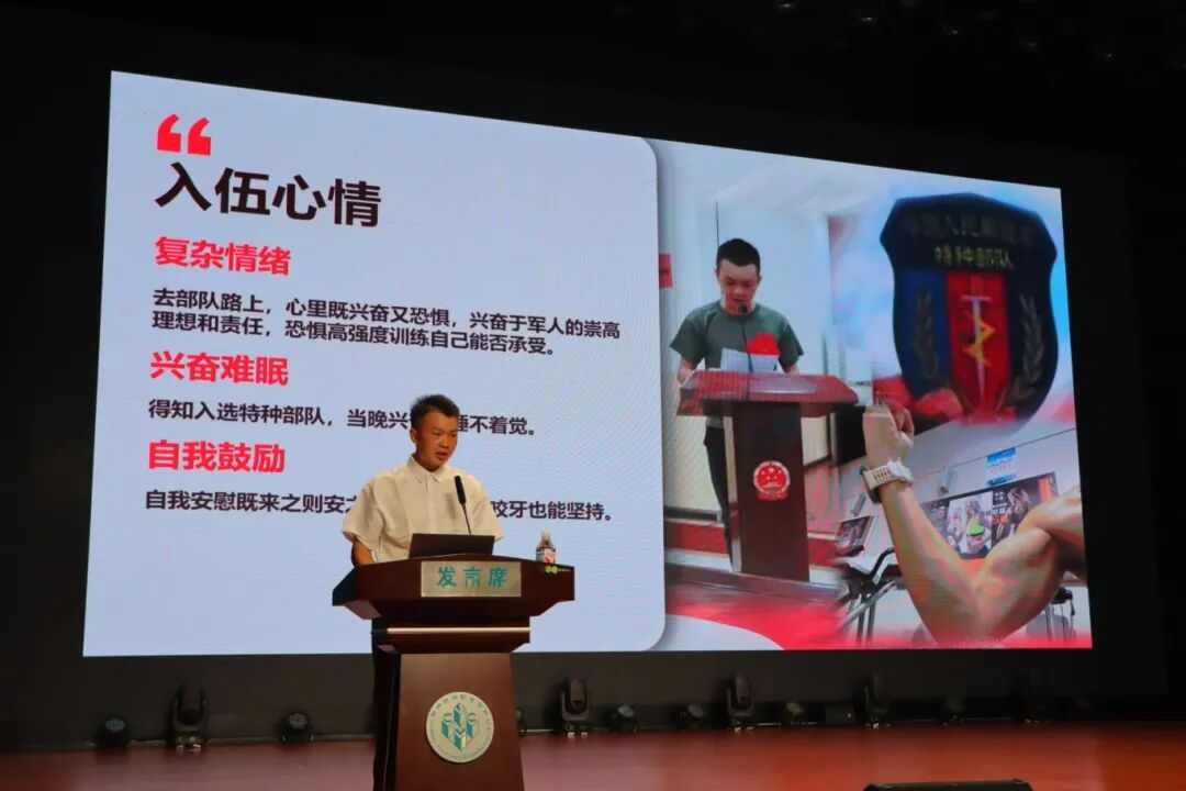 何计灵还向学生们回忆自己2015年参加阅兵训练的亲身经历,他与受阅士兵们在训练场上反复磨炼队列动作,从步幅步速到整齐划一,每个细节都经过千锤百炼。在烈日下一遍遍练习,汗水浸透了军装,只为在阅兵式上展现中国军人最昂扬的姿态。这段与战士们同甘共苦的训练岁月,成为他军旅生涯中最珍贵的记忆,并以此鼓励同学们树立报国志向,无论是在军营还是平凡岗位,都可以通过努力奋斗,实现人生价值。随后,两名退役复学士兵代表分享了他的从军经历。他们动情讲述在西藏边境巡逻的艰苦岁月,甚至曾经写过遗书的经历,用亲身经历鼓励同学们不怕苦、不怕累,在青春年华里砥砺前行,他们的故事展现了当代军人不畏艰险、保家卫国的崇高精神。
