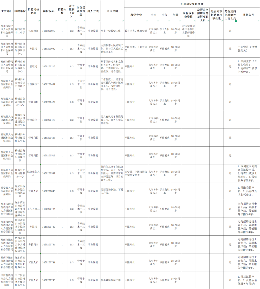 1.对报考县城、乡镇事业单位,以及工勤技能、中高级职称岗位的人员,学历年龄可适当放宽。具体条件以《柳州市公开招聘事业单位工作人员岗位表》(以下简称《岗位表》,附件1)为准。