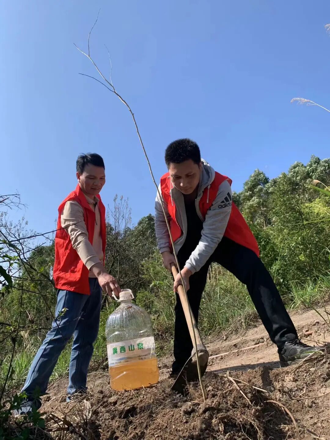 植树活动现场,志愿者们热情高涨、分工协作、挥锄挖坑、扶苗稳干、填土压实、提水浇灌,一株株刚刚栽种的新树苗迎风挺立,错落有致,为春日大地增添勃勃生机,大家干劲十足,配合默契,在协作中凝聚志愿服务力量。自治区第一荣军优抚医院和柳州市退役军人关爱协会参加此次义务植树志愿服务活动。