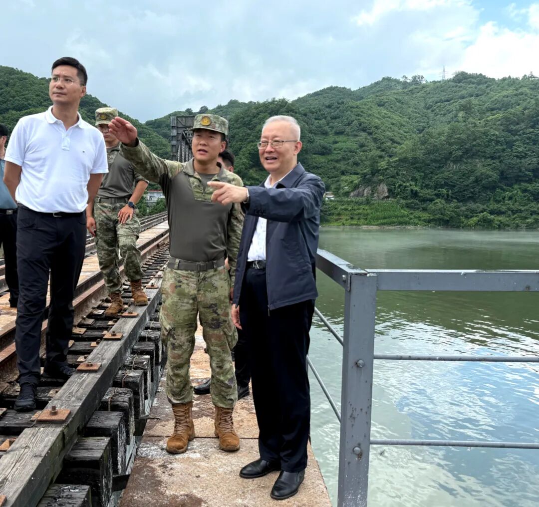 李世杰(右一)在鸭绿江断桥进行调研。