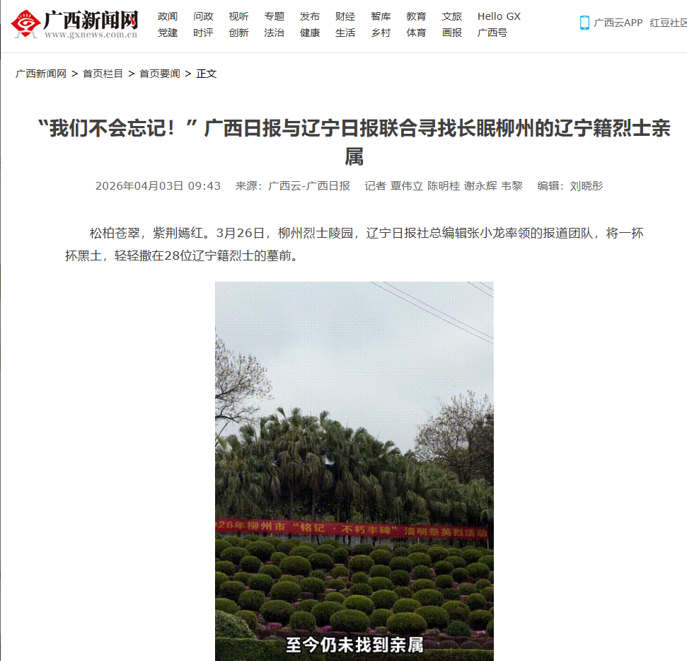 多家媒体转发关注丨“我们不会忘记!”广西日报社与辽宁日报社联动,寻找长眠柳州的辽宁籍烈士亲属