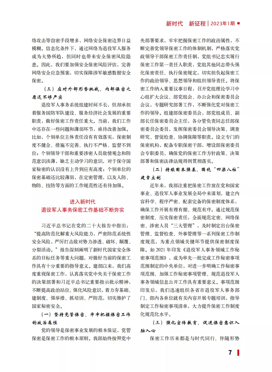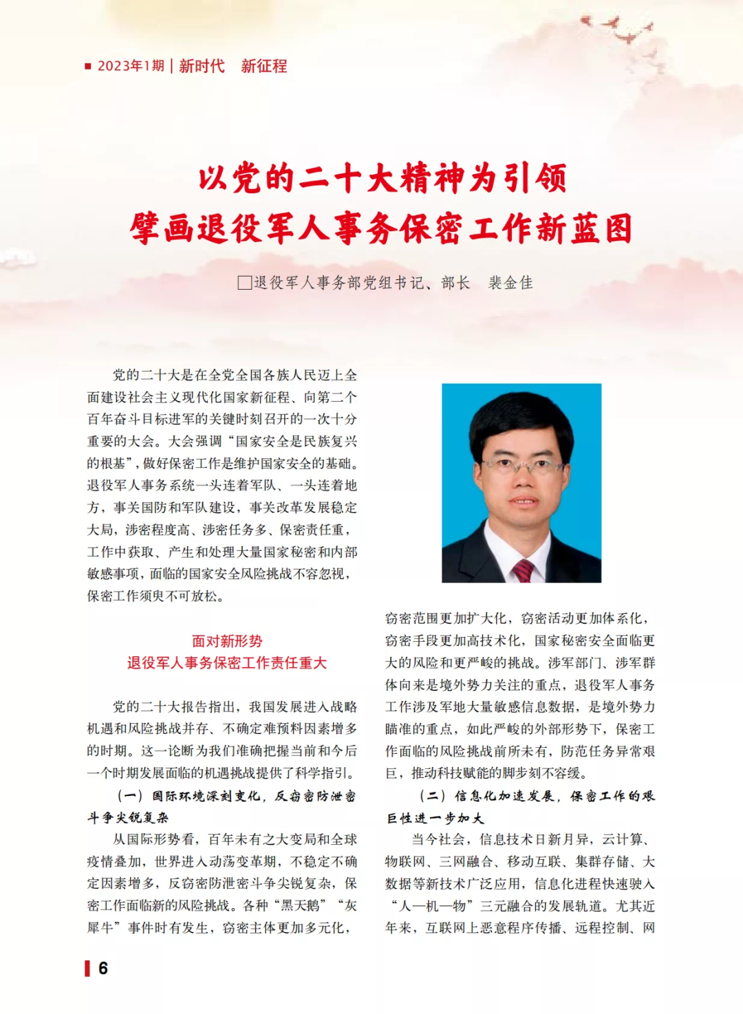 《保密工作》杂志2023年第1期发表退役军人事务部党组书记、部长裴金佳同志署名文章《以党的二十大精神为引领 擘画退役军人事务保密工作新蓝图》,请看全文——