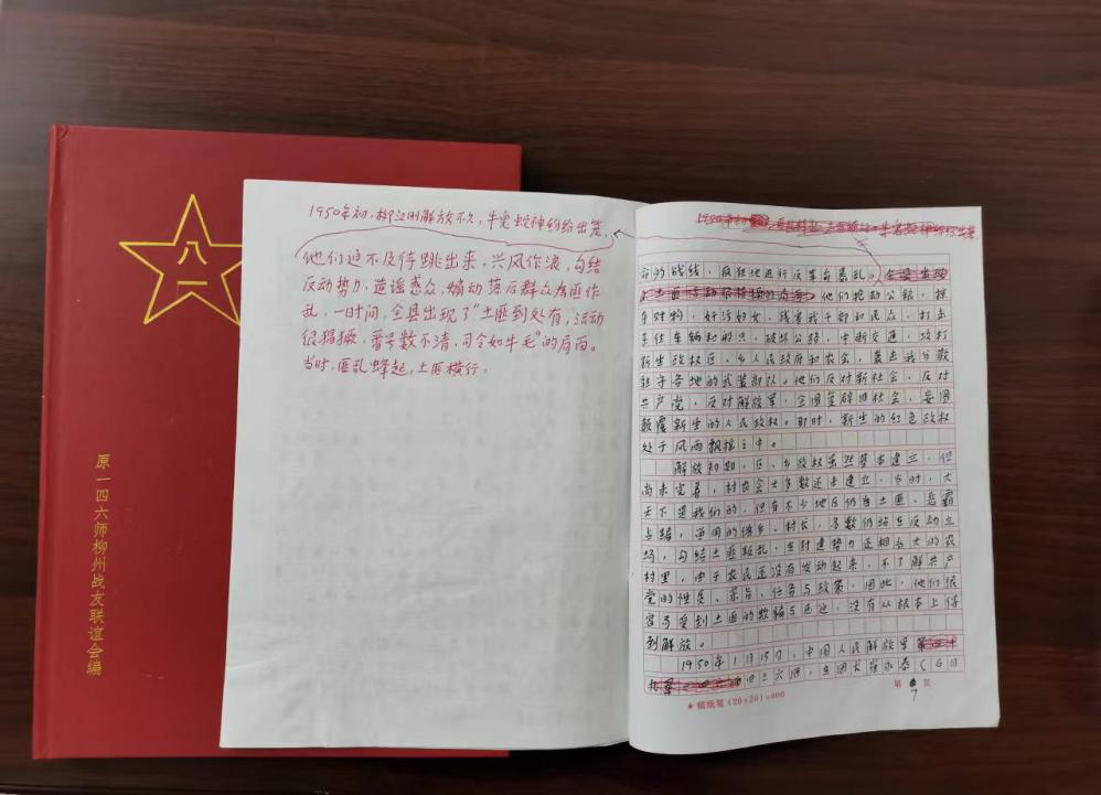 近日,按照市退役军人事务局开展全市烈士史料和遗物征集工作进度安排,市烈士陵园管理中心主任黄斌杰一行,先后拜访了原中国人民解放军一四六师四三七团司令部防化股参谋刘立圣同志、四三六团文化教员覃海江同志、一四六师司令部作战参谋刘馨同志,收集五十年代初柳州剿匪战斗中牺牲的烈士史料和遗物。耄耋之年的老战士们深情回忆五十年代初期柳州剿匪斗争的峥嵘岁月,深切怀念剿匪战斗中牺牲的战友们,热情提供剿匪时期牺牲的烈士史料、遗物征集详细线索,并向市退役军人事务局赠送了柳州剿匪历史著作、一四六师柳州战友联谊会纪念画册、剿匪纪实手稿等资料。