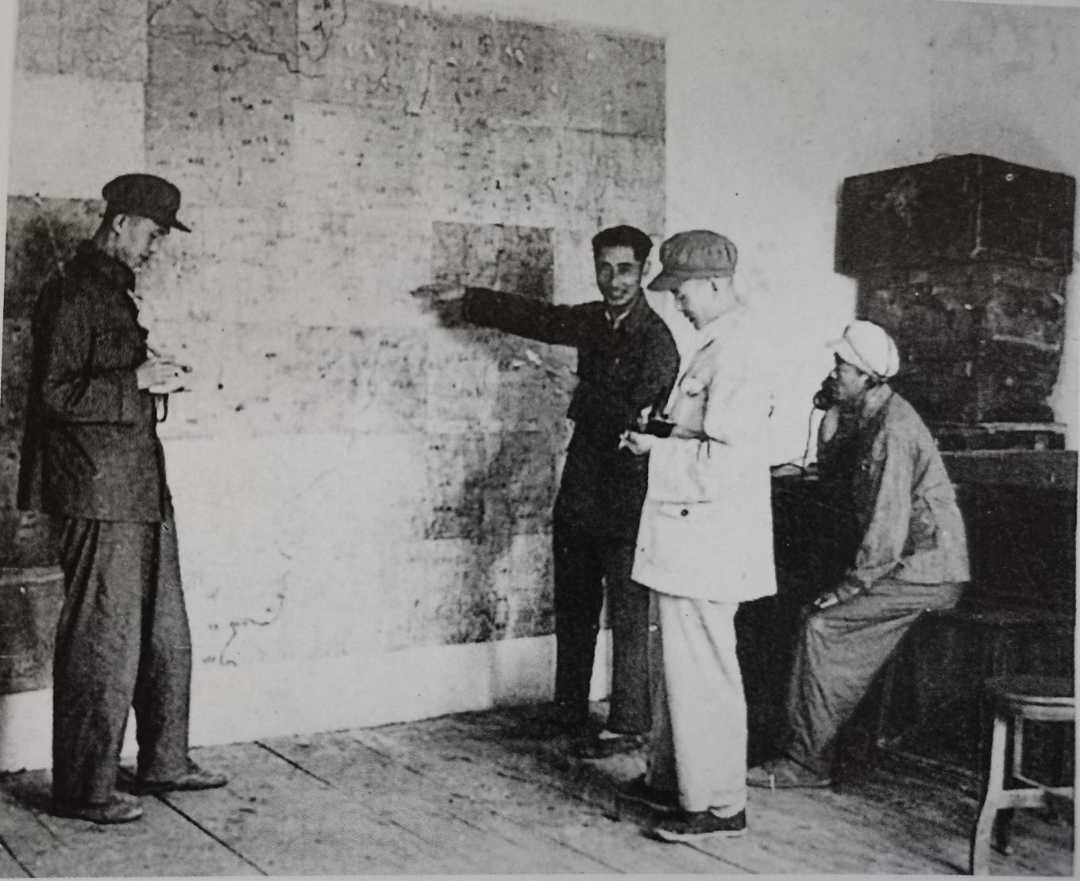 一四六师师长王奎先(左二)向通讯科长王进臣(左三)、师作战参谋刘馨(左一)布置剿匪任务。来源:《柳州剿匪》,中共柳州市委党史研究室编。