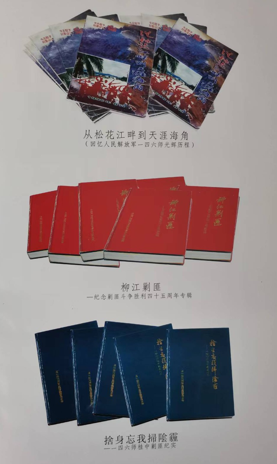 老战士向市退役军人事务局赠送的部分柳州剿匪历史著作。来源:《纪念册——庆祝柳州解放暨桂中剿匪六十周年》,原一四六师柳州战友联谊会编。