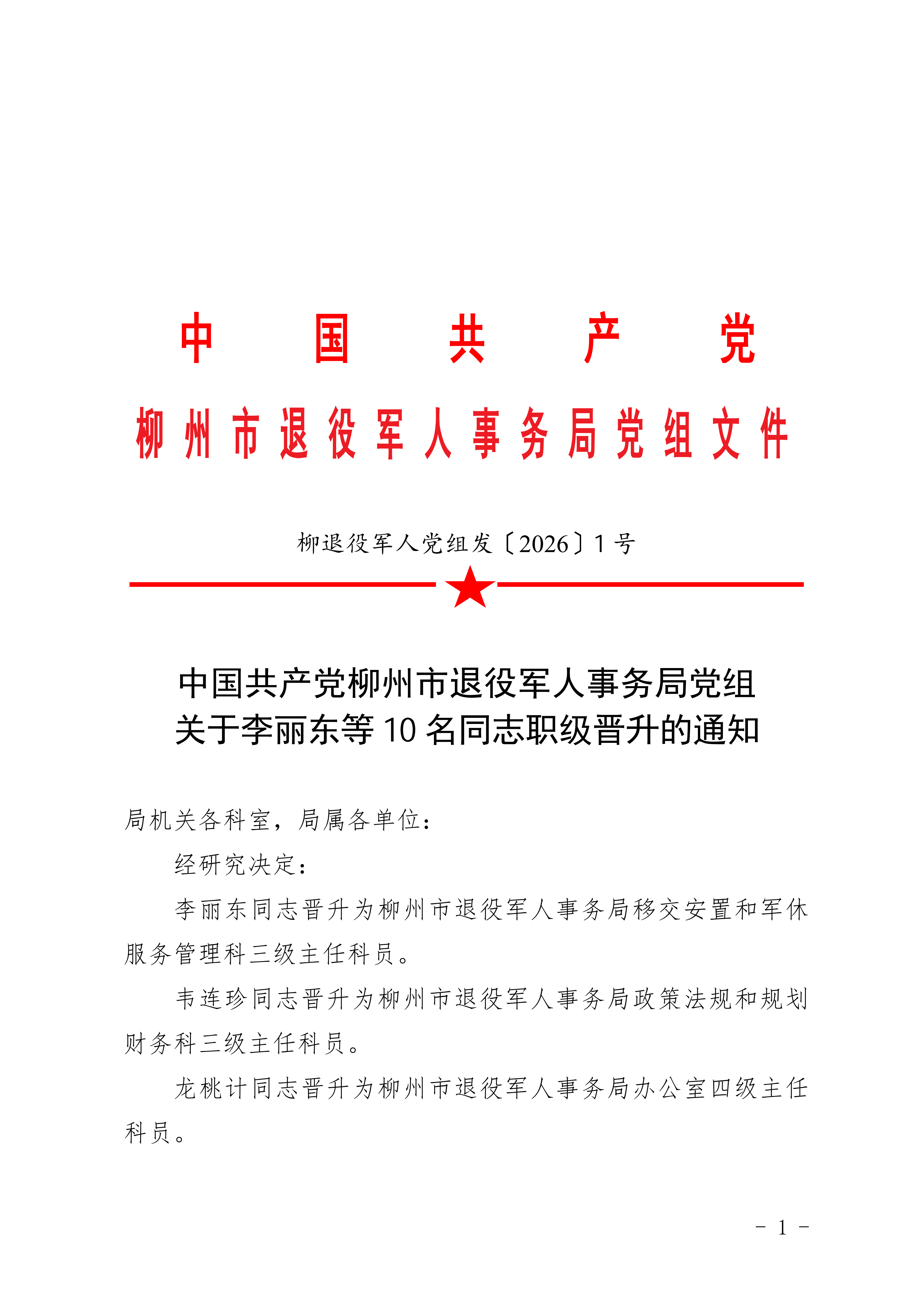 中国共产党柳州市退役军人事务局党组关于李丽东等10名同志职级晋升的通知