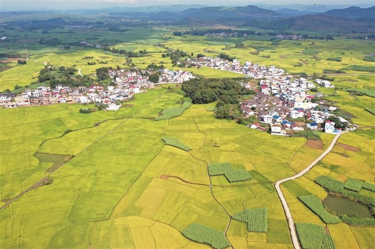 10月19日,柳城县古砦仫佬族乡稻田阡陌纵横,与错落有致的村庄、绵延的山脉构成一幅美丽的丰收田园画卷,吸引不少游客前来赏景拍照。