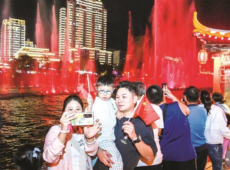 游客乘游船看柳江水上音乐喷泉。在柳州静兰水上运动中心附近水域,游客乘坐“大黄鸭”游柳江。百里柳江是游客游柳的必打卡地。无论白天或黑夜,柳...