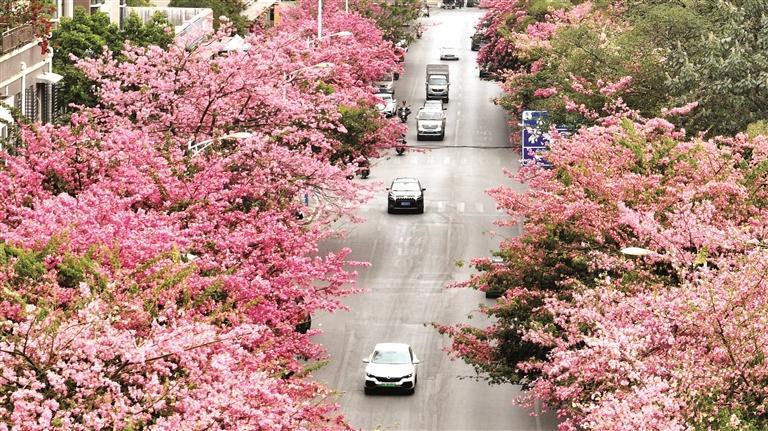 11月24日,育才路附近,美丽异木棉花竞相绽放。初冬时节,市区多条道路旁的1万多株美丽异木棉进入花期。竞相绽放的粉色花朵如梦如幻,仿佛给街道披...