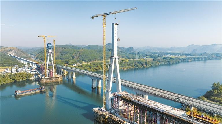 12月1日清晨,船只从正在施工作业的柳梧铁路盘龙柳江特大桥下方水域经过。11月30日起,柳梧铁路盘龙柳江特大桥首节钢箱梁顺利吊装就位,标志着该大...
