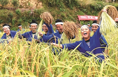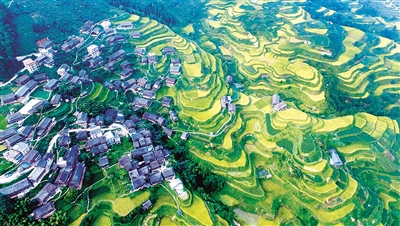 这是9月15日在三江侗族自治县独峒镇知了村拍摄的侗寨梯田风光。 秋高气爽时节,三江县的水稻进入成熟期,层层叠叠的金黄梯田与笔直的高速公路...